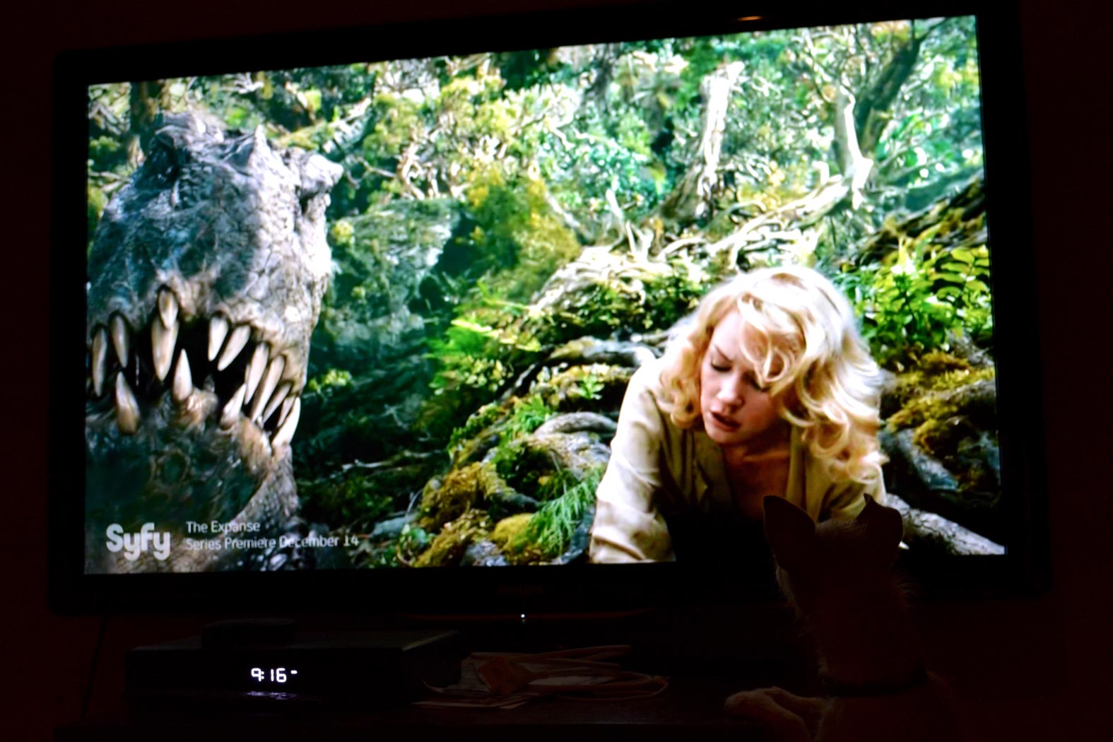 Pancake gets a little too excited during exciting parts of movies. We were watching King Kong and the dinosaur chasing Naomi Watts had her up at the TV. I don't care for the movie once they get back to the city and I wanted to change the channel but Pancake was watching the whole time. She watched until the credits rolled.
