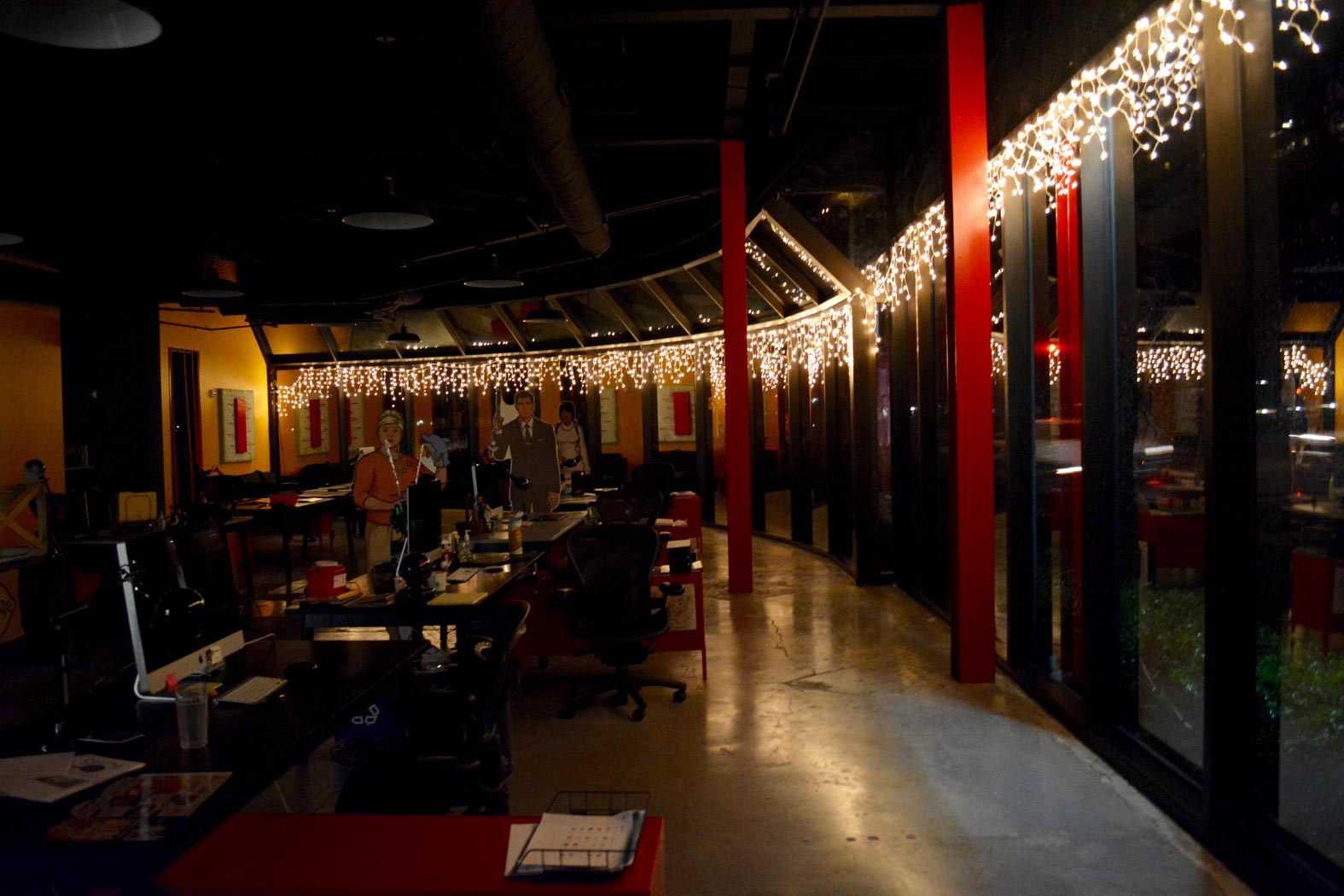 I worked a little late today and with the time change recently it gets completely dark in the office pretty quick. Especially since we have trees all along all our windows in the office. And from over on this side of the office no matter where you stand it looks like all the Archer people are looking at you.