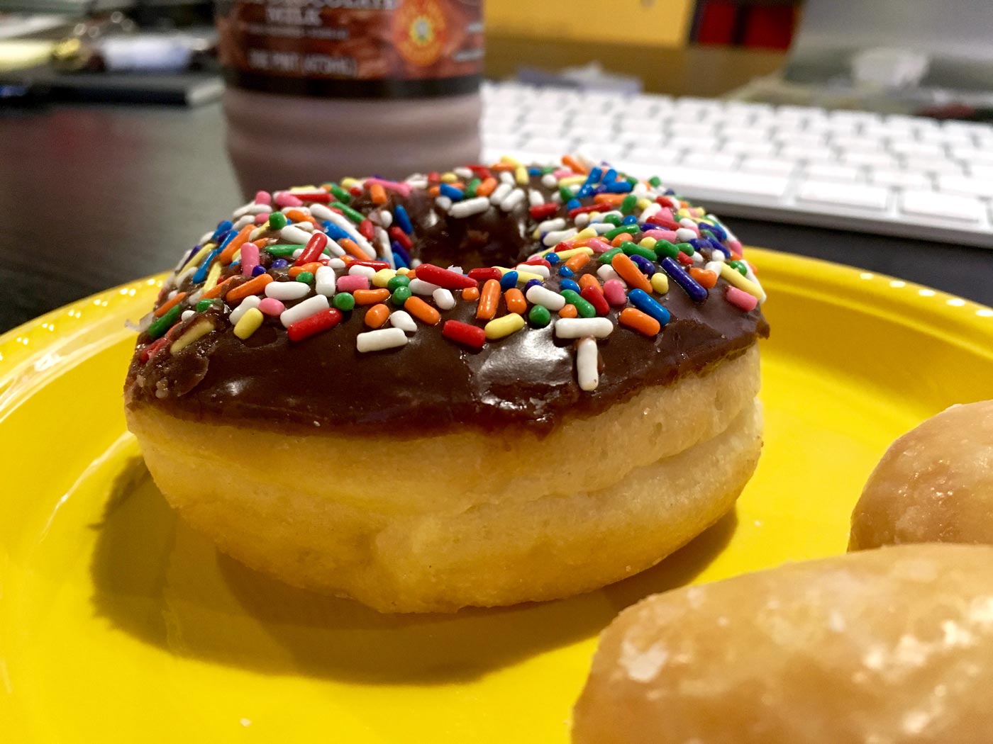 Our office breakfast this morning consisted of donuts. I got one with sprinkles and a few donut holes. I also had a chocolate milk. Made for a nice sugar rush and the eventual sugar crash.