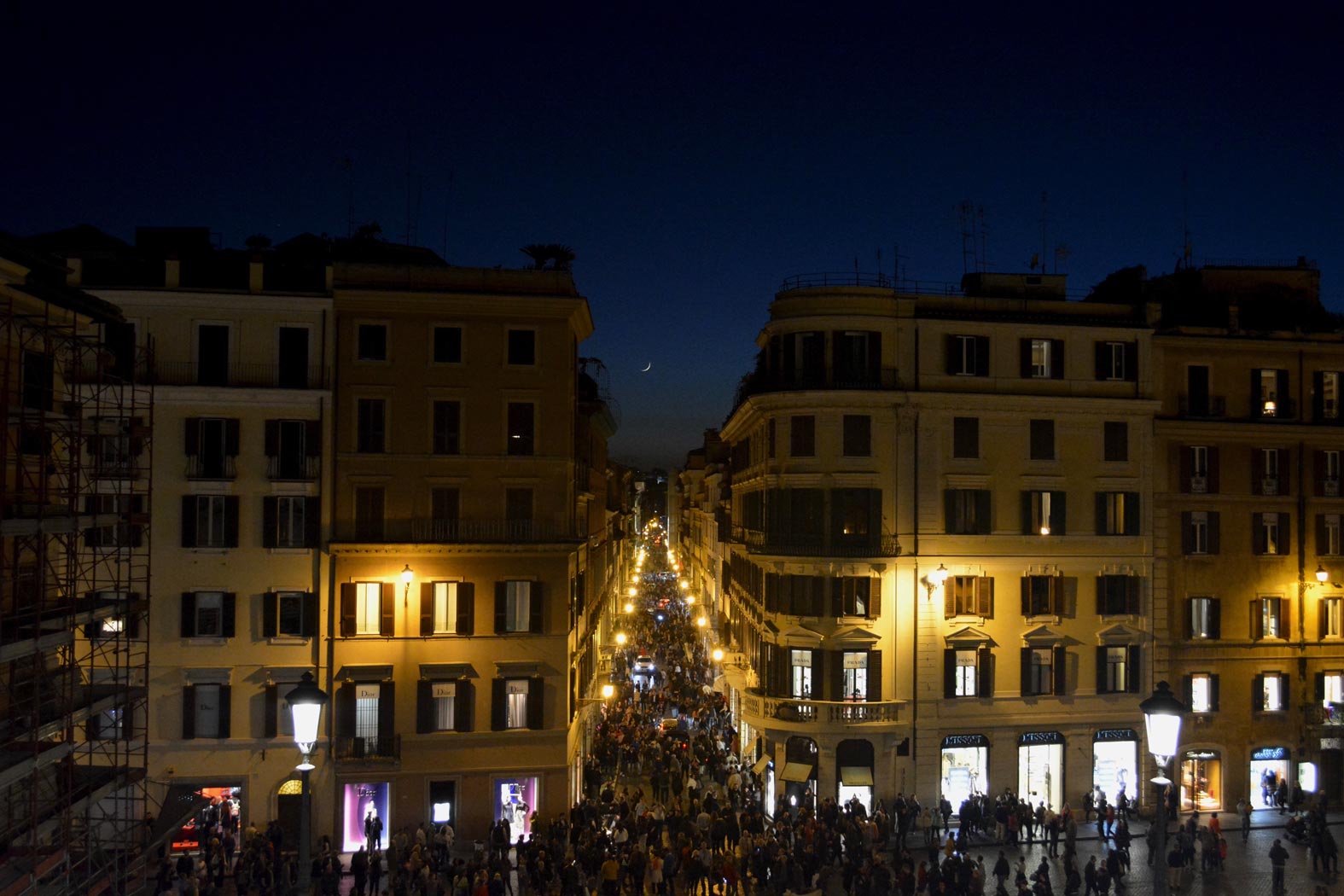 November 1, 2016 - Tuesday - Our idea of a vacation is definitely not to be on the go the entire time so after the overseas flight and full day trip yesterday we got a caught up on our sleep a bit today. We made it to the top of The Spanish Steps and took this photo of the crowd and the crescent moon. We made it to the Trevi Fountain later. They're both beautiful at night.