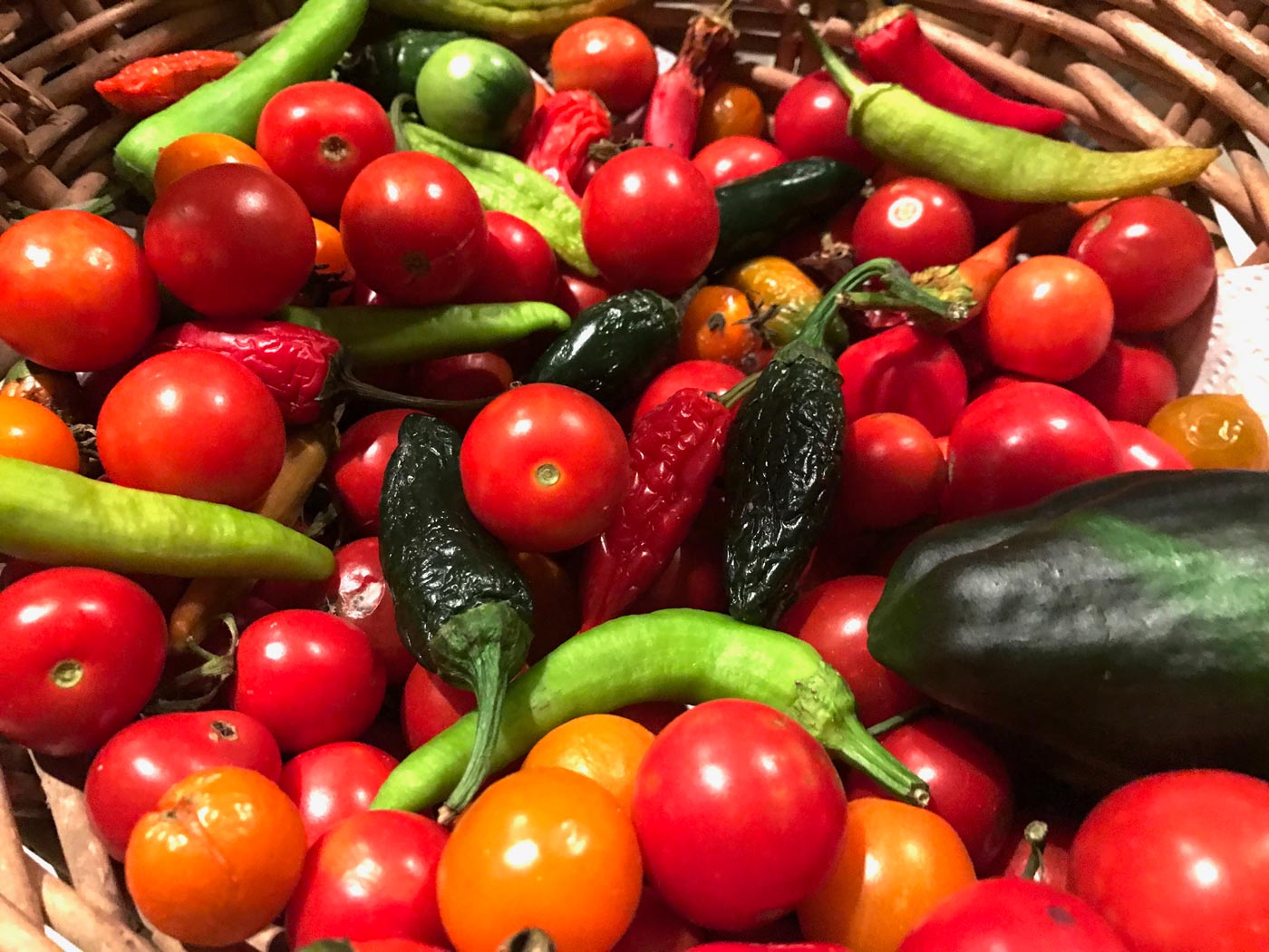 November 7, 2016 - Monday - Drove out to Dad's to pick up the dogs. I went over to visit my brother. He had this basket on his table full of stuff from his garden. He gave me a bunch of tomatoes. I texted my friend about some basil from her garden. Now all I need is a friend who makes fresh mozzarella. Caprese salad is in my future.