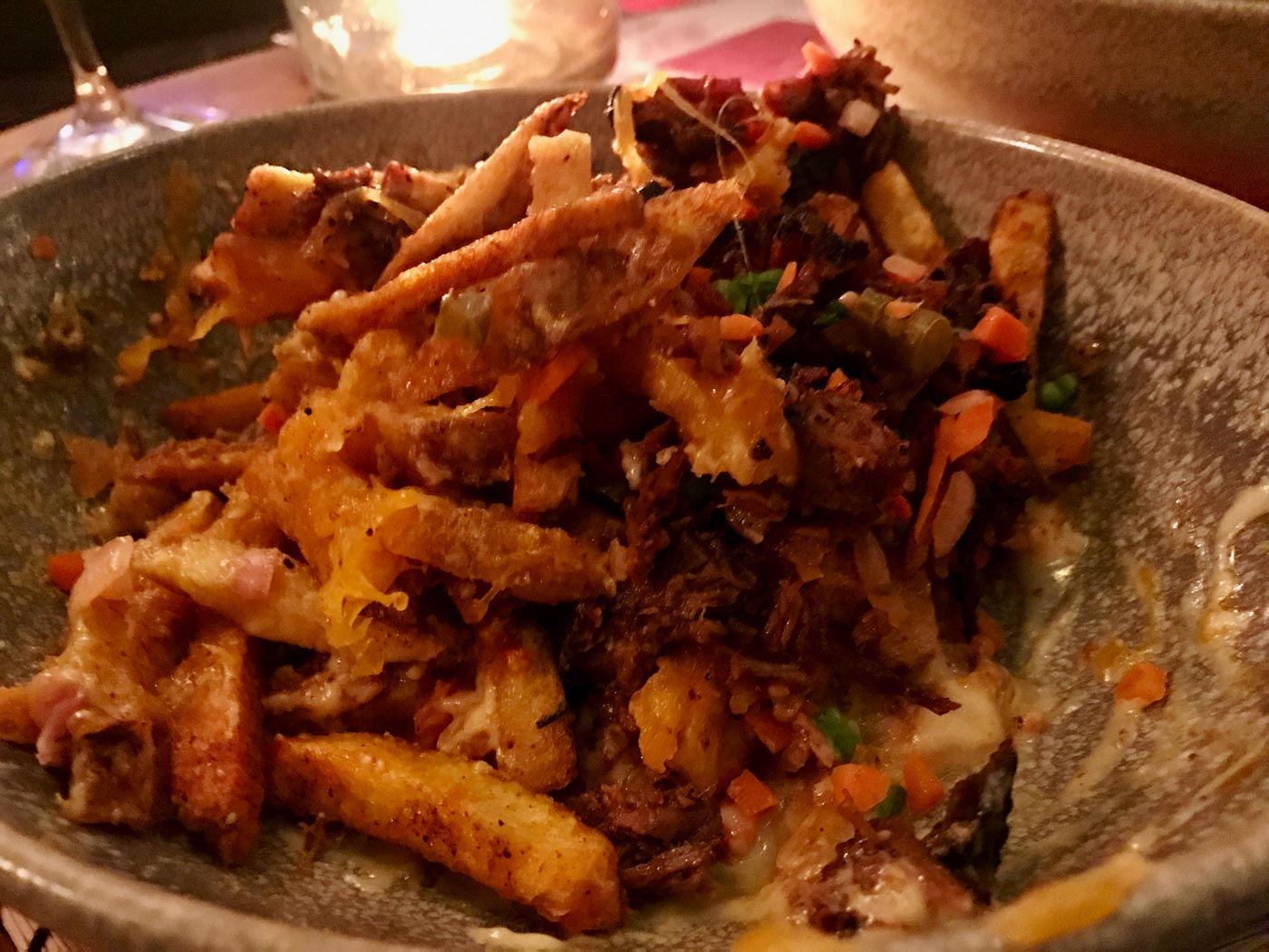 November 30, 2016 - Wednesday - Went to meet a friend for food and drinks after work. The drink specials were good. These were "burnt end" fries, which sounds good, but really I think this is just cheese fries with chopped beef on it. Which is still good, but is a bit disappointing when you're expecting burnt ends.