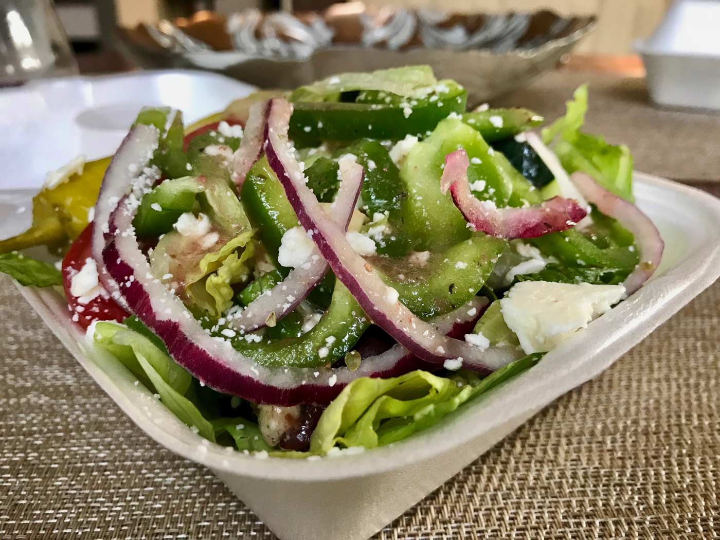 April 24, 2018 - Tuesday - A friend is having some work done at her house so I picked up dinner from one of our favorite Greek places and brought it over. This salad is pretty basic but whatever is in the dressing is really what makes this special and one of my favorites.