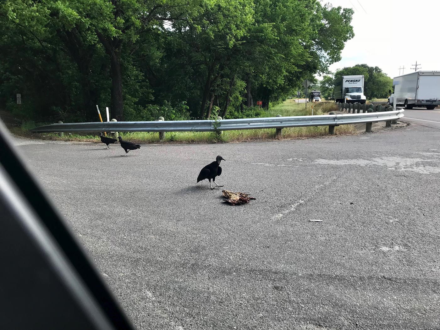 May 14, 2018 - Monday - On my way to work this morning I came up to these three eating "something". I thought they would fly off when I got closer, but since I was pulling up slowly to this stop sign one of them decided he wasn't going to walk away from his breakfast. The other two were chicken. There was quite the aroma when I rolled down the window to take this photo.