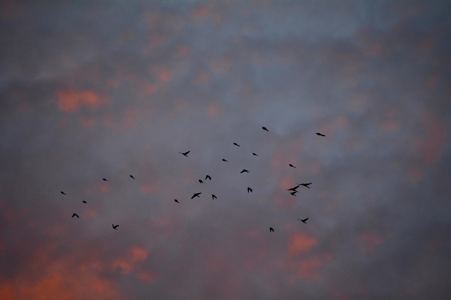 January 24, 2019 - Thursday - It's nice to have a bit of a normal schedule this week. Walking out of the office today the sun was setting and there was a nice glow on the clouds. I was hoping this little group of birds would fly a bit more in front of the clouds but this turned out pretty nice any way.