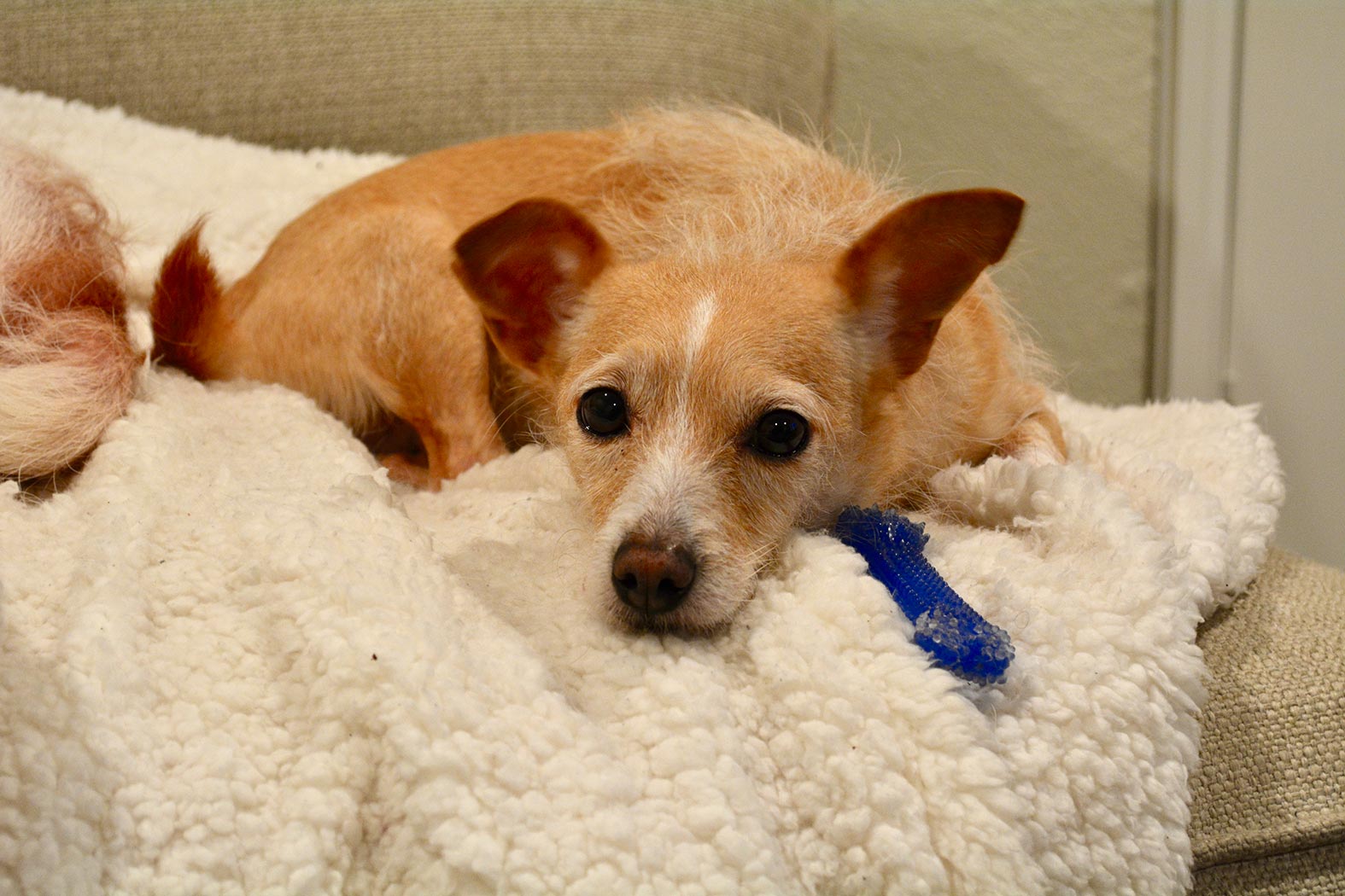 March 21, 2019 - Thursday - I kinda feel guitly when I take a photo of one of the dogs and not the other so here's Pancake with her favorite toy. When she's excited she'll run around with it and throw up in the air. The look on her face with it goes behind the couch is really funny.