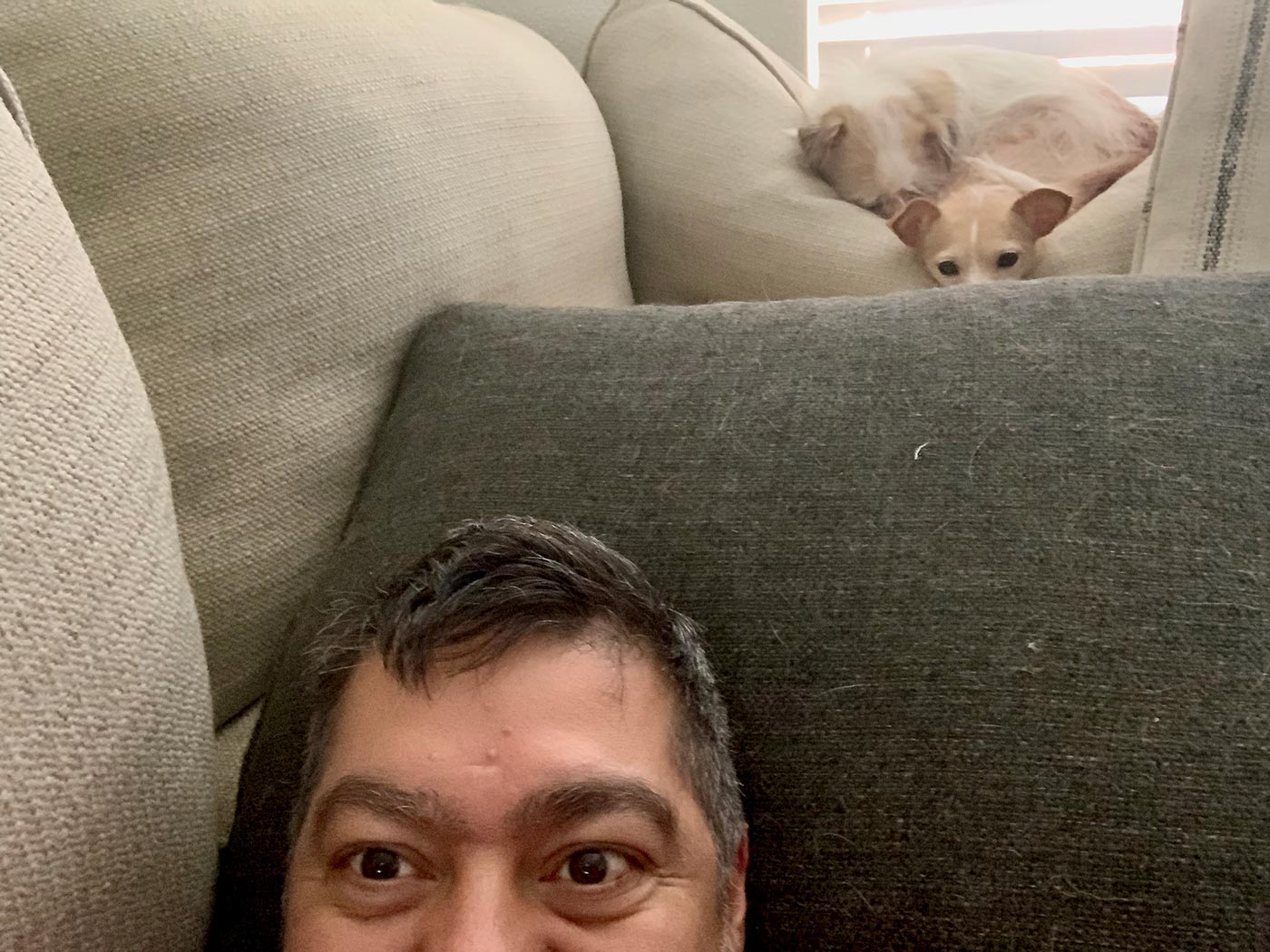 February 24, 2020 - Monday - I was still not doing so well and I called in to work. I'm doing better but still not good. This was some time midmorning. Zak was laying next to me and I was trying to get a photo of him but only Pancake and Biscuit would lay still for a photo.