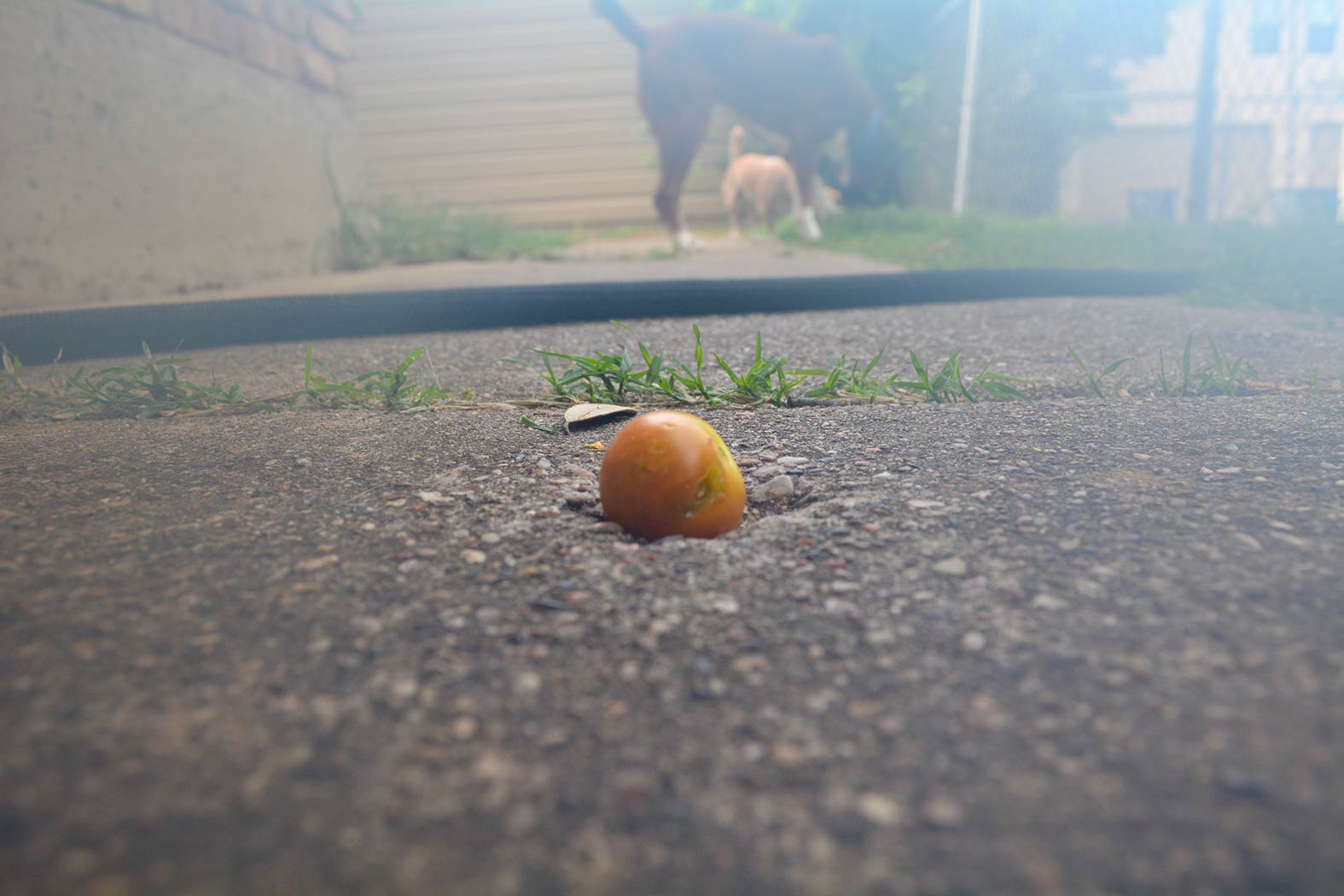 July 1, 2020 - Wednesday - I walked out this morning and saw this little tomato plucked off by a bird lying in the middle of the sidewalk. I went in to get my camera and took this just as my camera lens was fogging up then my camera battery died. I went in to get my other battery and it was dead too. So this is my photo for today, one dead little tomato.