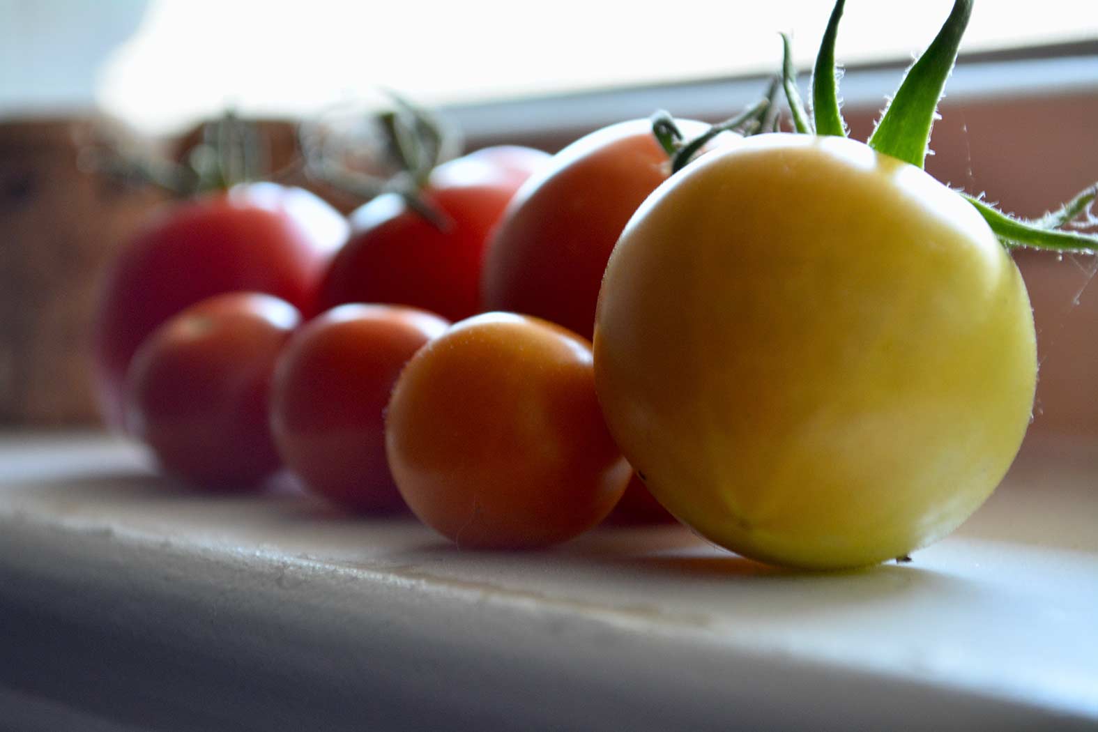 July 12, 2020 - Sunday - My brother told me to bring in my tomatoes as soon as they start to turn red to keep them from getting ruined by birds. He told me to let them finish ripening on the window sill. I brought in the one on the right this morning. I keep them in order left to right of ascending redness or descending ripeness.
