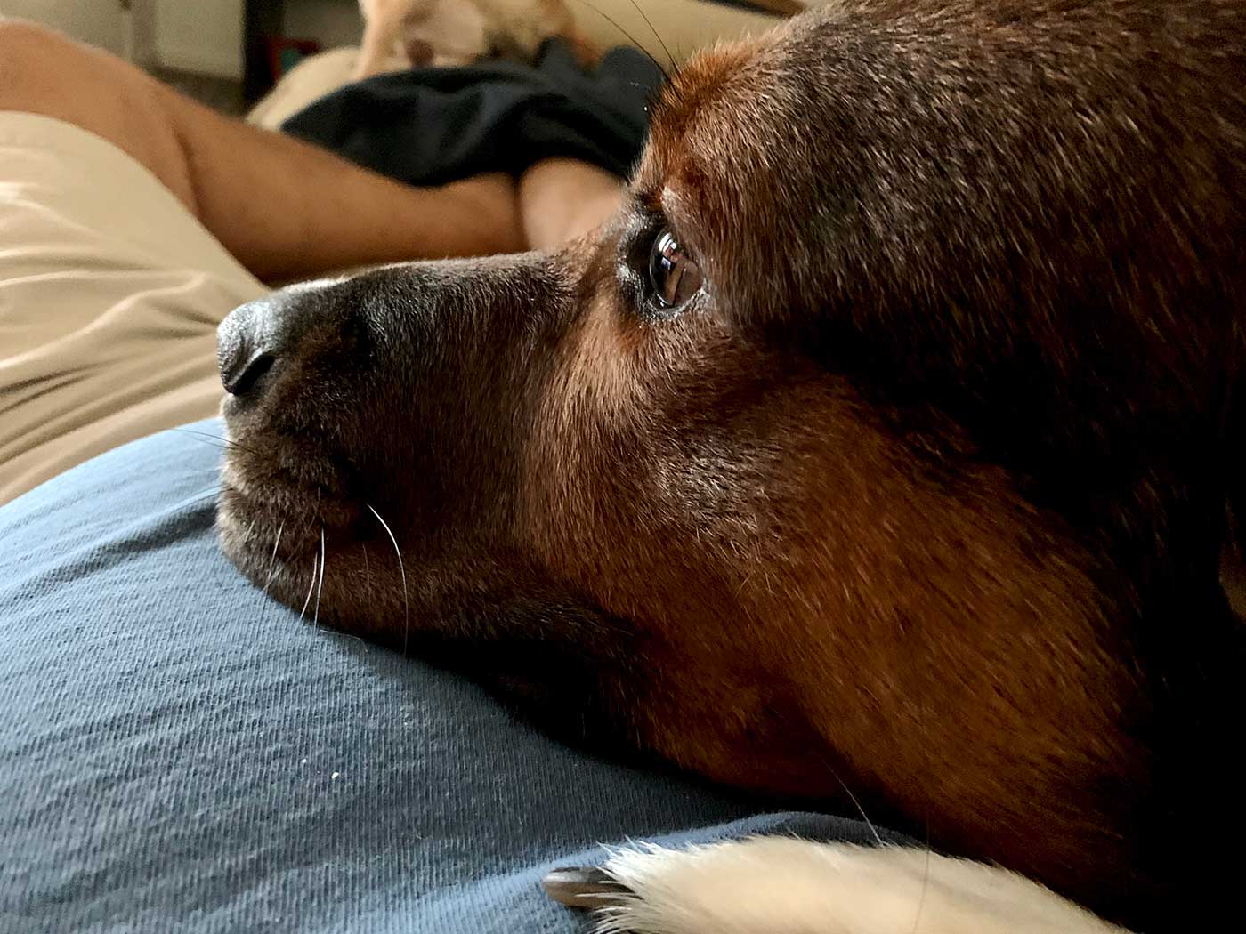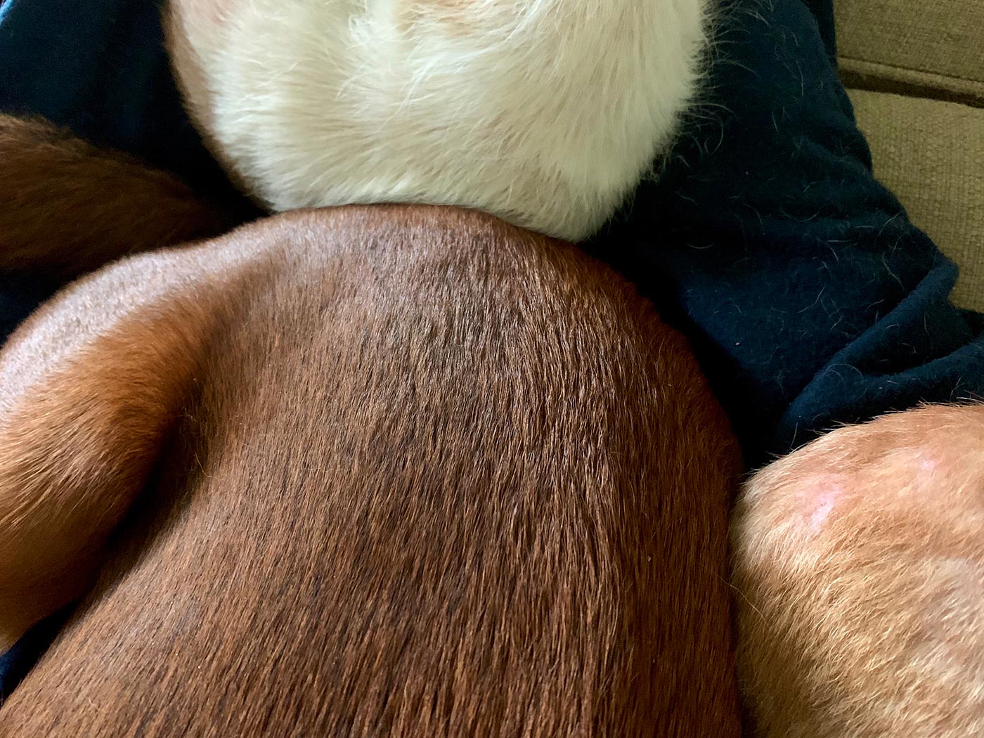 July 3, 2020 - Friday - This is an absolute first. I was laying on the couch with Zak. Biscuit was the first to come up and lay down right next to Zak. A few minutes later Pancake hopped up looking for a spot. She crawled over my chest and laid on my hip right against Zak's back. I couldn't believe they were all touching each other. Looks like I have a pack again.