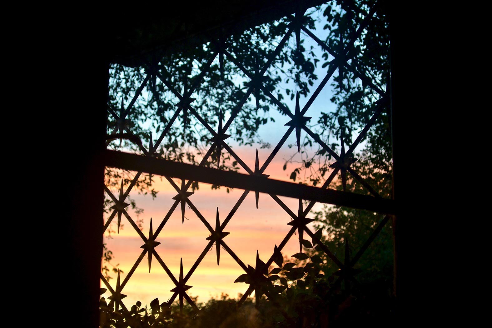 May 1, 2020 - Friday - This is the view out my front door. I really love all the natural light we have here. There are a couple of large trees in the front yard that shade the front of the house too. It's nice seeing the sun setting though the metalwork on the porch.