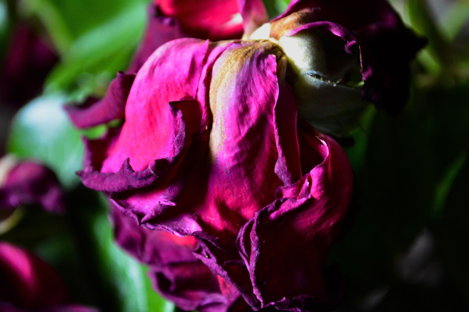 May 8, 2020 - Friday - The rose bushes out back have almost completely stopped blooming and so I stopped replacing them in the house. As they've withered they have darkened. I almost like the colors of them now more than before. They were a deep red before and have turned such a rich dark purple.