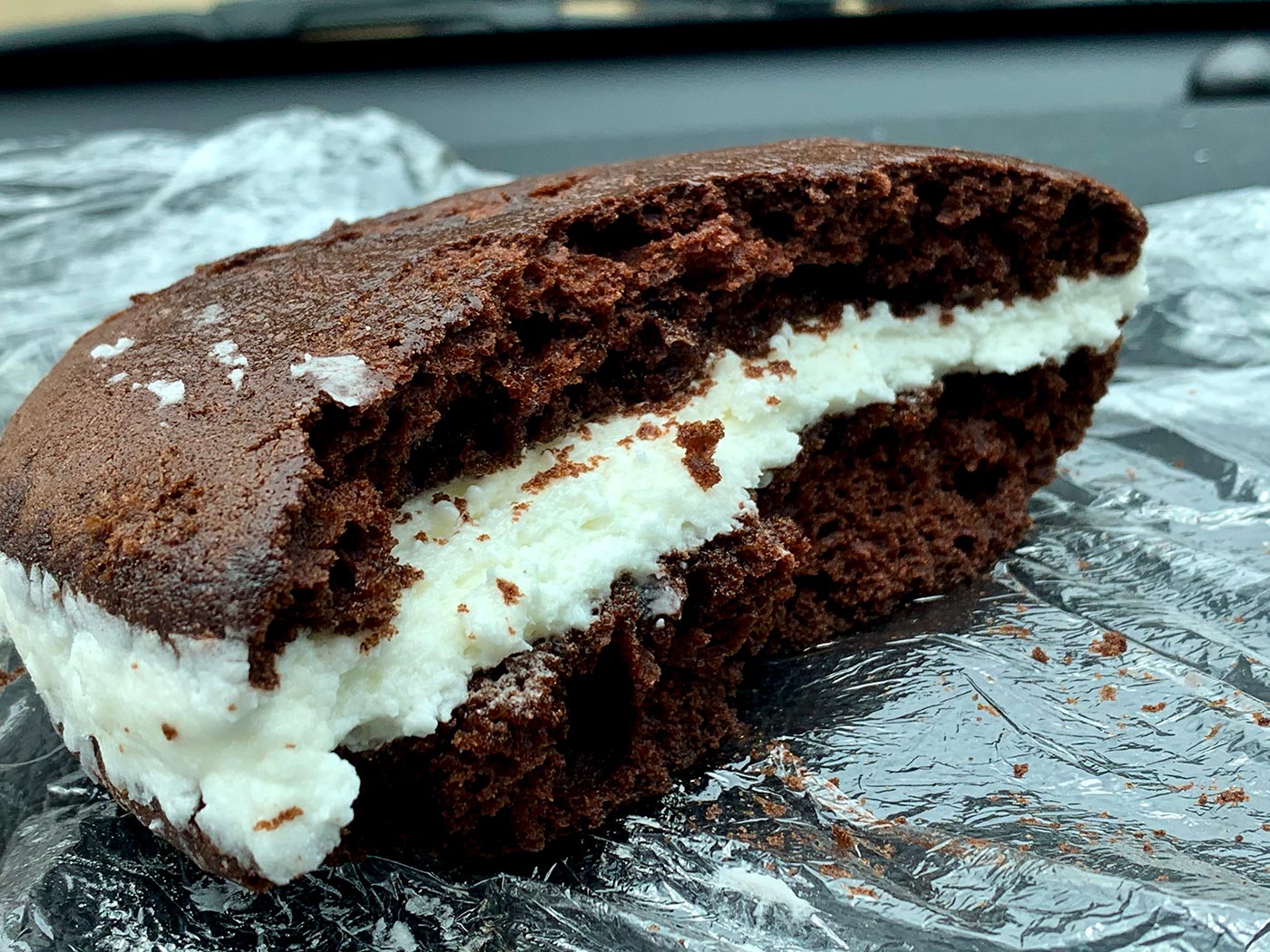 May 12, 2020 - Tuesday - I took the day to go out and spend with Dad and the rest of the family out in the country. My sister and I made the drive out to the Country Store for snacks. They only had one Chocolate Whoopie Pie left, but I got some pies and fresh sourdough bread. The whoopie pie didn't make it out of the parking lot.