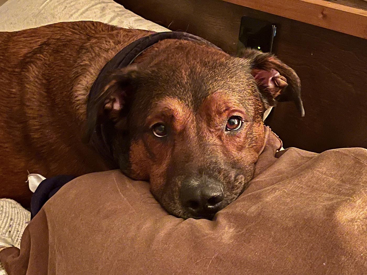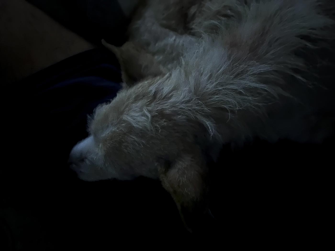 October 12, 2021 - Tuesday - Tonight I was relaxing on the couch with Zak. Pancake knows all she has to do is hop up near me and stare at Zak and he will move away. Once he left she curled up in my lap and went to sleep. I don't think I've ever had a wiry, scruffy dog like Pancake. She can be such a sweetheart.