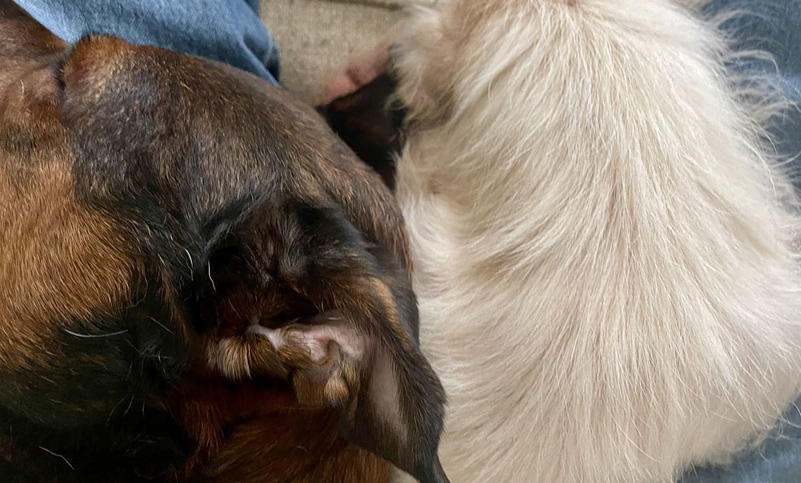 April 4, 2022 - Monday - Today I didn't do too much outside of returning all my work equipment back to the office. I spent some time on the couch this evening and it always makes me happy when Biscuit and Zak lay down next to each other. Still waiting on Pancake to warm up to Zak.