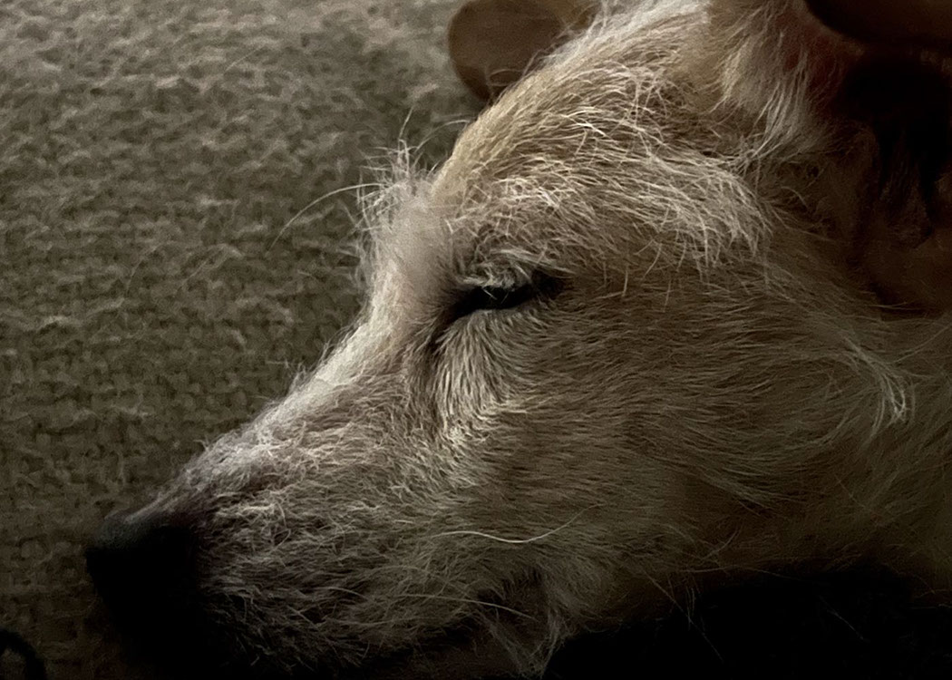 April 26, 2022 - Tuesday - Biscuit was on the couch rolling around on her back near me today. I don't know why her eyes look all crazy when she's on her back but I thought I'd get a picture of it. If she rolls over enough her lips flap open and you can see how crazy her teeth make her look too.
