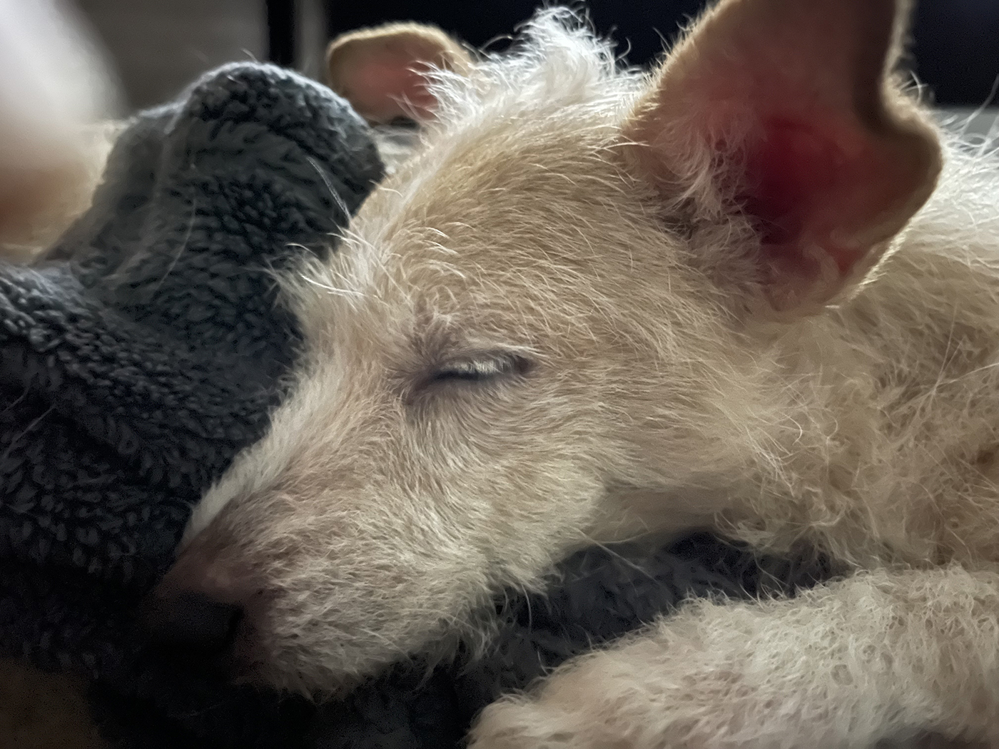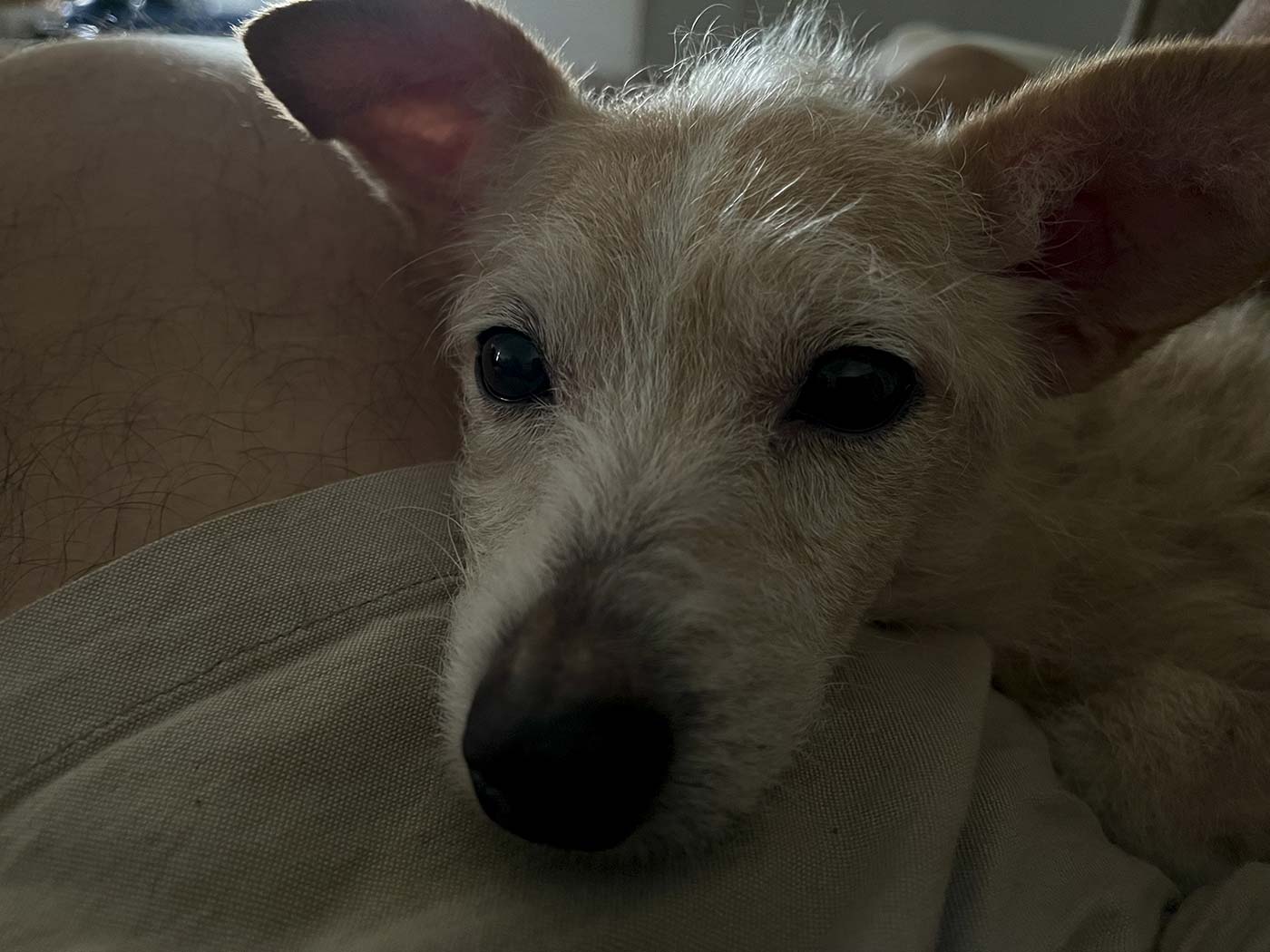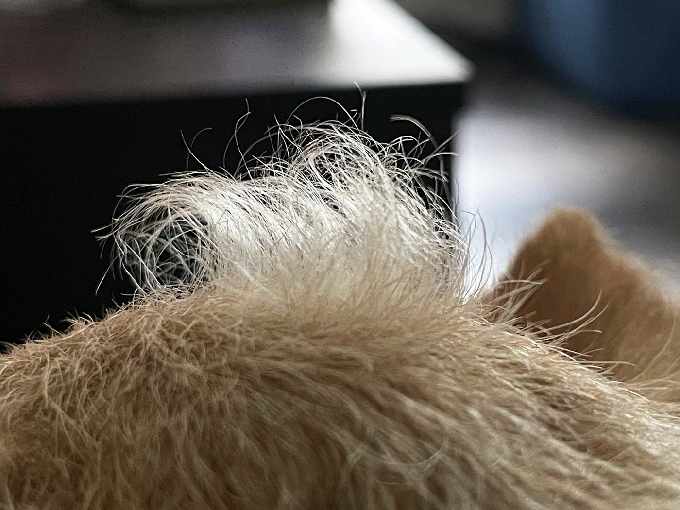 April 27, 2022 - Wednesday - As usual lately, Pancake is by my side while I'm sitting on the couch. Her little mohawk isn't what it once was but it's still fun to fluff up. Plus she sits still for it too.
