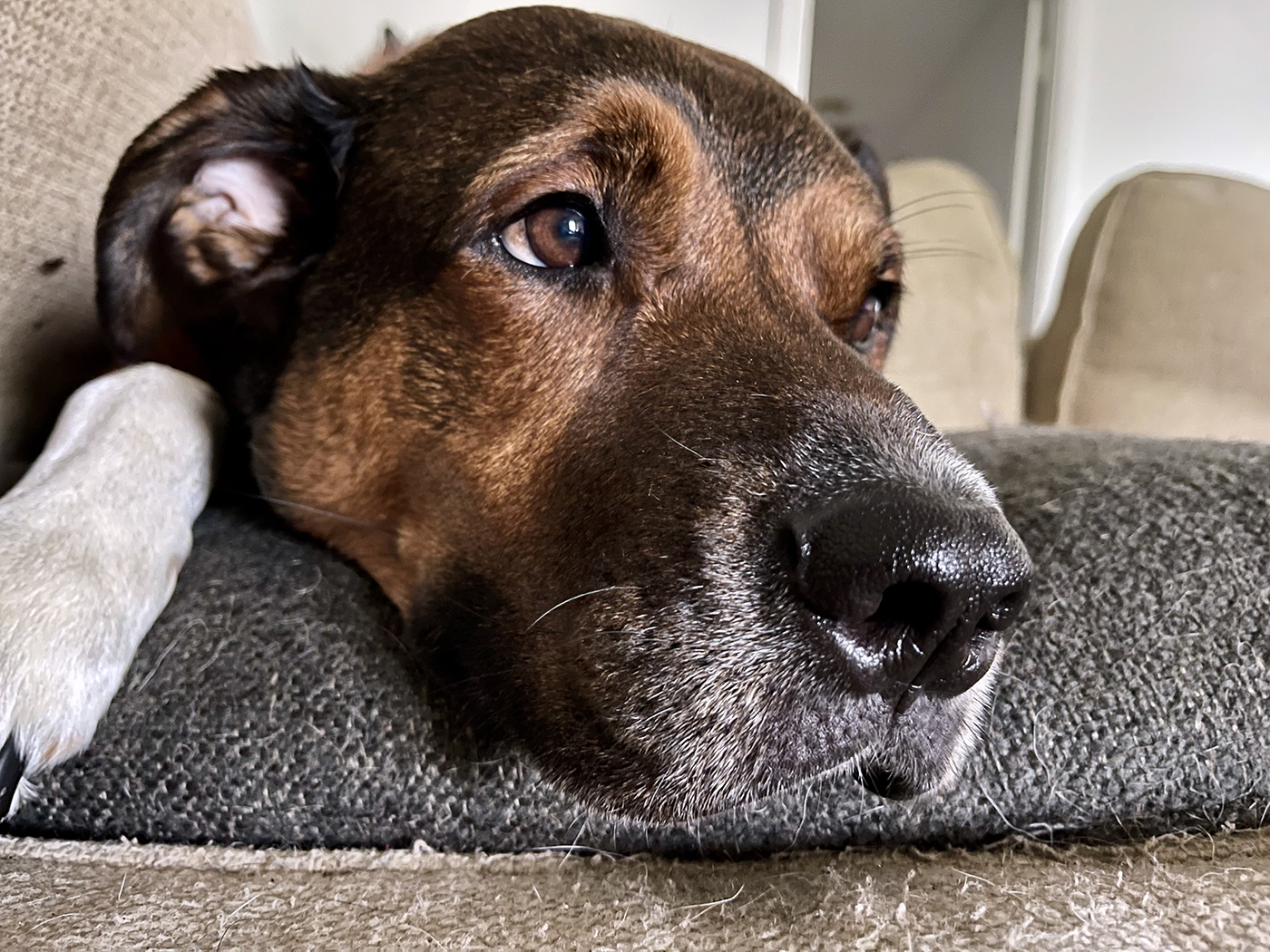 April 23, 2022 - Saturday - I woke up quite motivated today. I did some cleaning and laundry. I did a bit of cooking and some work out in the yard. At the end of the day I came to sit on the couch and watch a movie. Zak was relaxing in the corner of the couch and I got this photo of him in the evening light.
