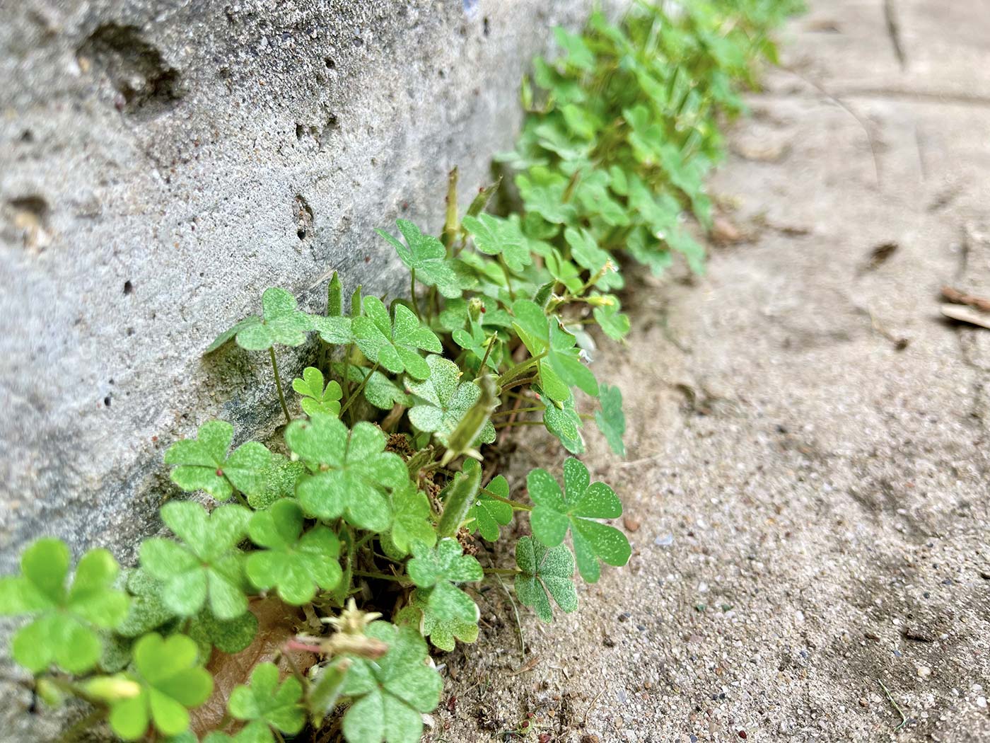 May 9, 2022 - Monday - I was out back yesterday and I noticed this long row of whatever these are growing in the crack between the foundation and the walk that goes down the side of the house. I'm guessing these are weeds but I spent a few minutes looking to see if I could find one with four leaves. No such luck.