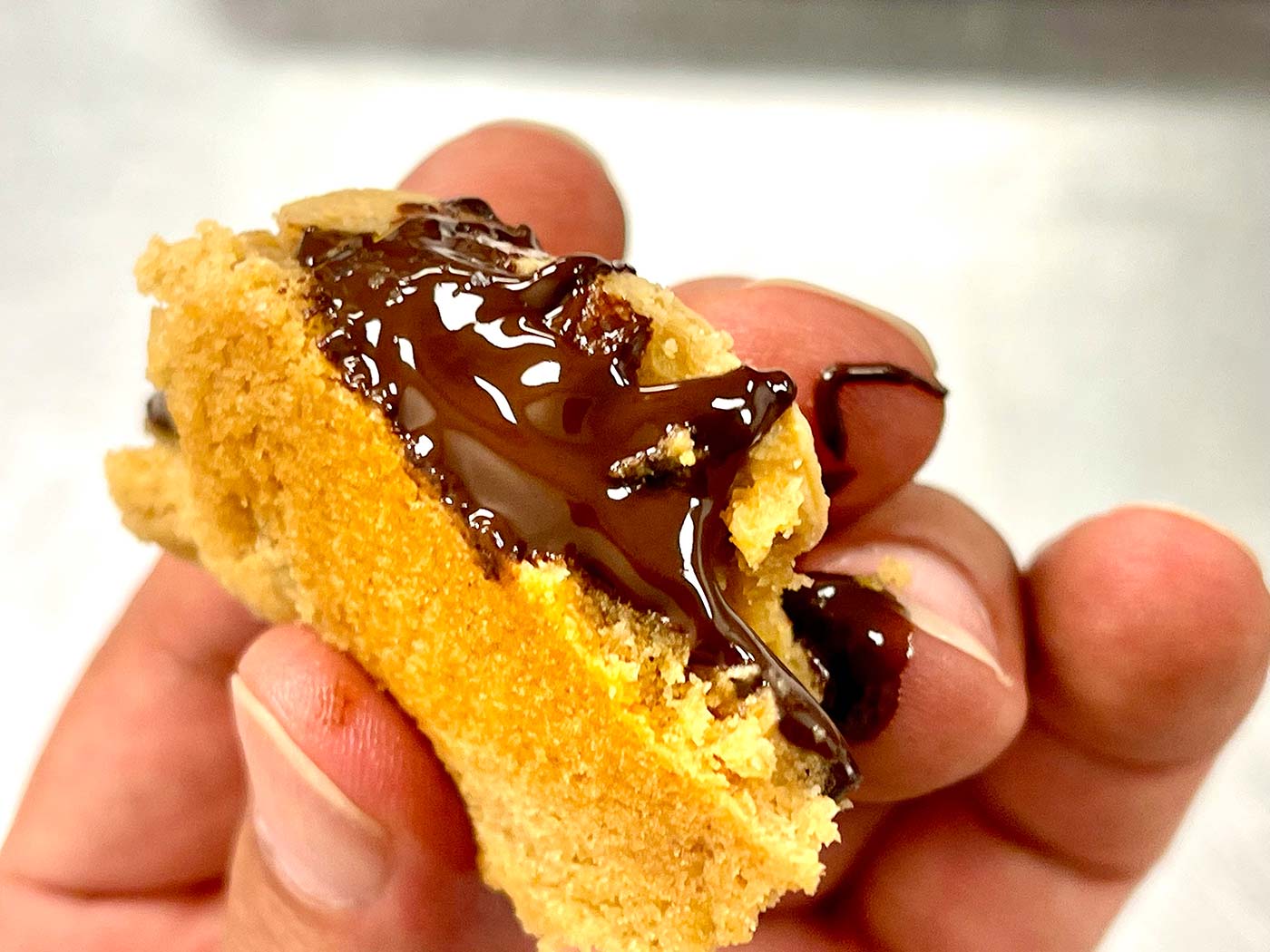 May 17, 2022 - Tuesday - Today I joined my friend at the bakery to get some new footage. One of the perks of being in the kitchen with her is getting to taste some of her ideas. This is a Peanut Butter cookie with a chunk of dark chocolate inside. The hardest part was waiting for it to cool enough to eat. Had I known how good it tasted I probably would have burned my mouth on this.