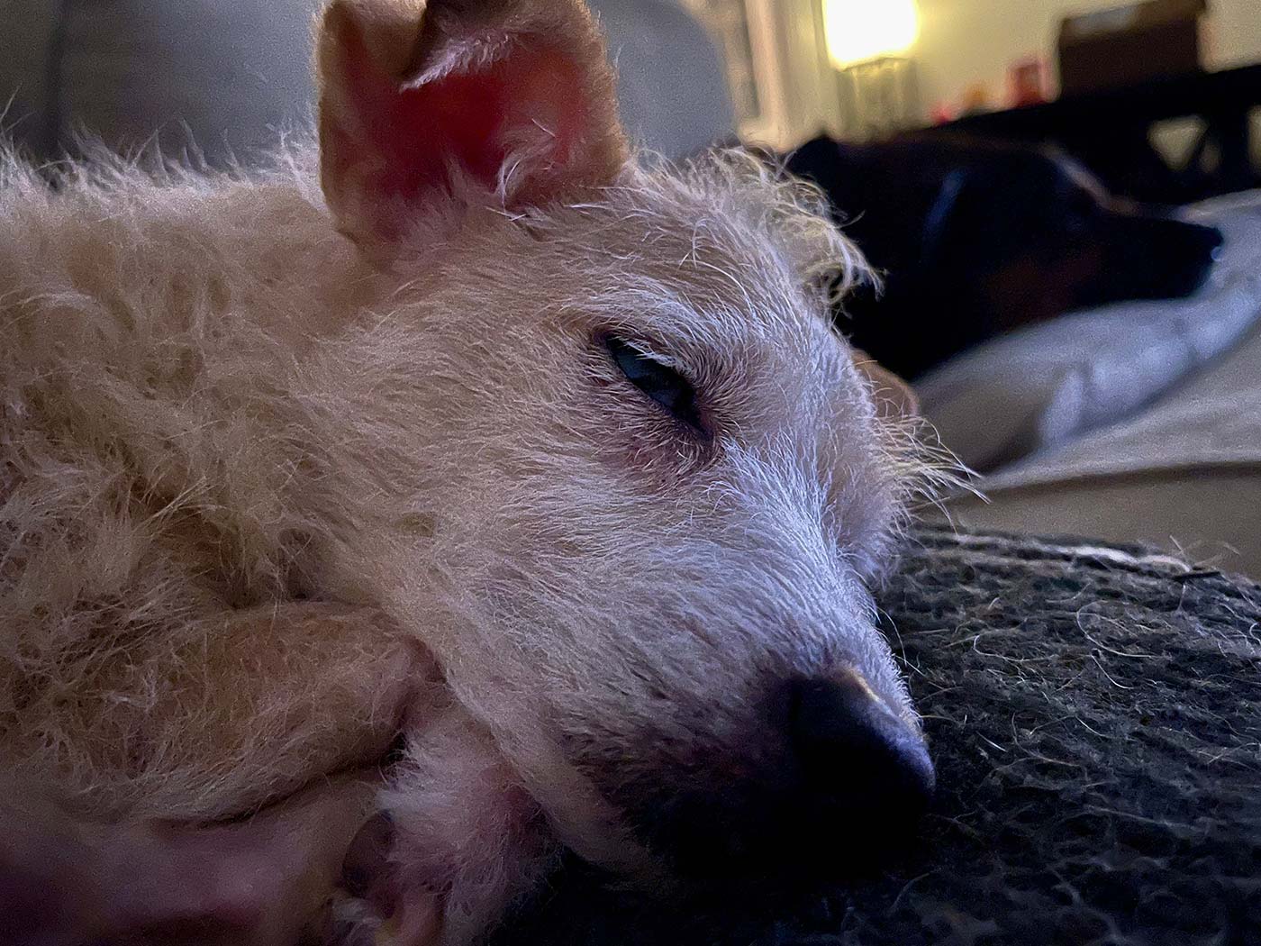 May 23, 2022 - Monday - I always get a little excited when Zak and Pancake lay anywhere near each other. Pancake will go lay in Zak’s kennel sometimes. She looks tiny laying in the middle of bed in his kennel.