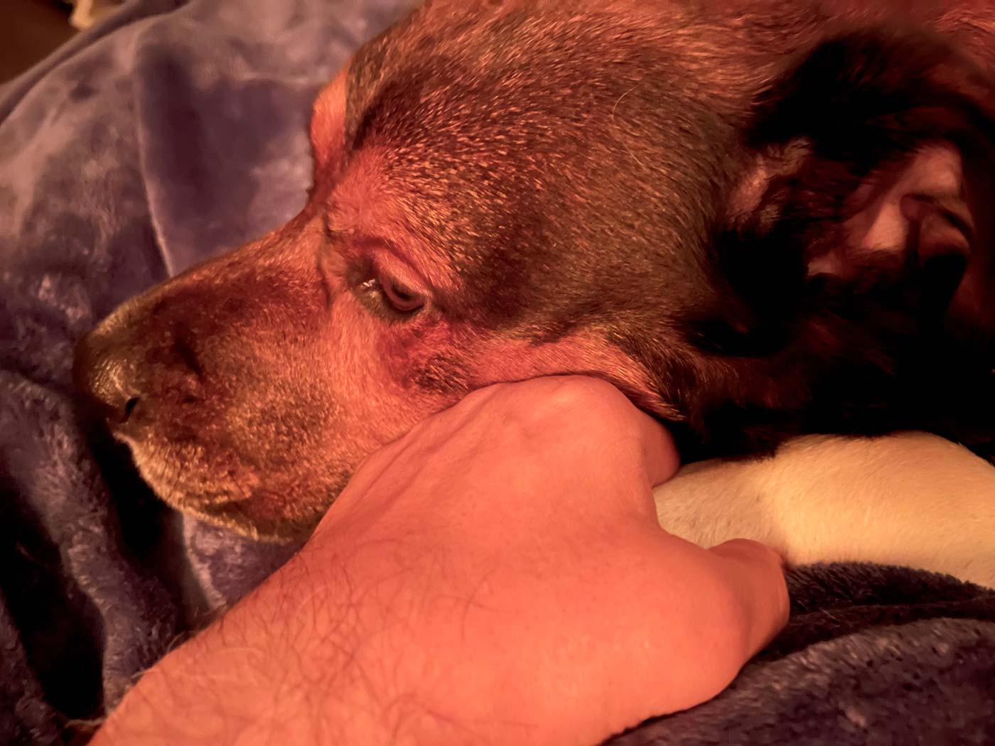 May 24, 2022 - Tuesday - This evening it started raining. Zak’s a big chicken when it comes to bad weather, especially thunder. He was on the couch when I went to bed. After turning off all the lights lightning struck lighting up the whole house. Zak came right into my room and jumped in bed. He usually doesn’t like his paws being held unless he’s scared.