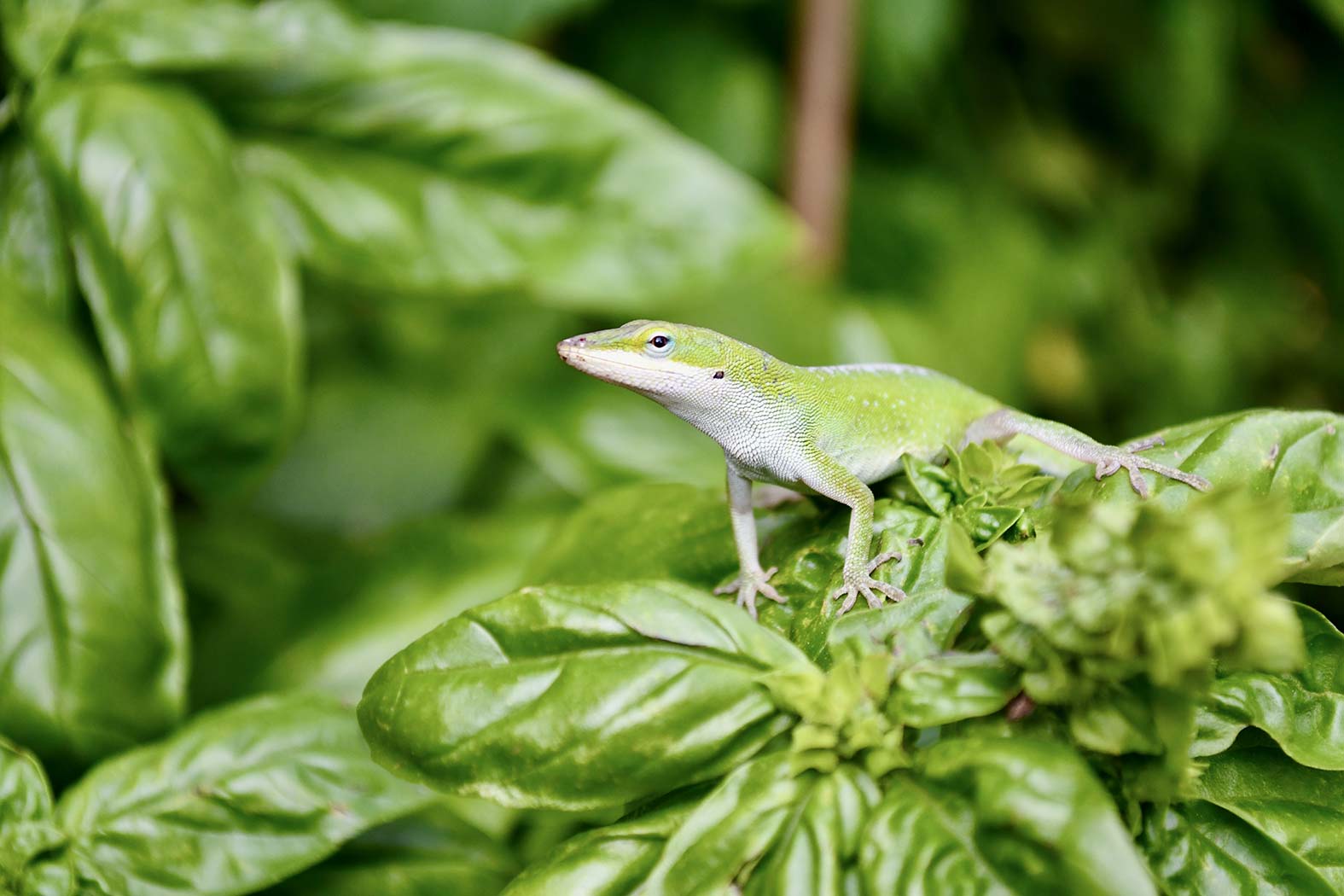 May 16, 2022 - Monday - I was out back with my friend's dog so she could do her business. I was standing next to my friend's garden. She had some beautiful tomatoes and a dill "tree" that's huge. I think this little one was standing on top of the basil keeping an eye out for snacks. It stuck around long enough for me to go in and get my camera.