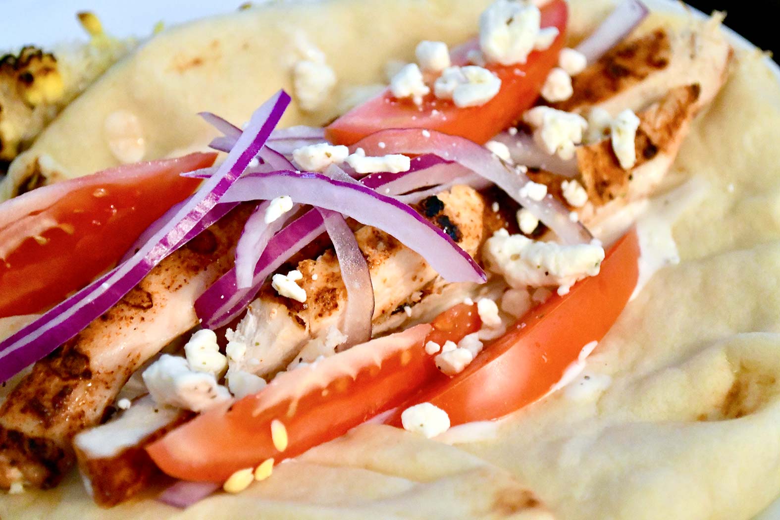 May 21, 2022 - Saturday - I saw a nutritionist yesterday while I was visiting my rheumatologist. She was really nice and asked me to keep a "food diary." This my entry for lunch, spicy grilled chicken with onions, tomatoes and feta on warm pita. There was some grilled zucchini and corn too.