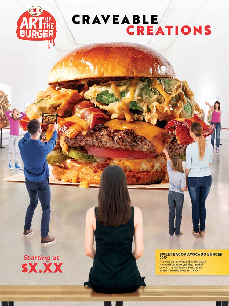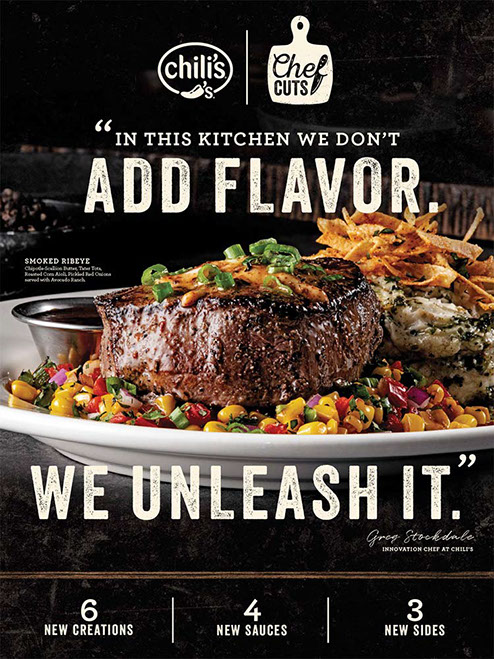 the vast majority of the work i've done for chili's global division has been around promotions that occur a few times a year. some are smaller promotions with only a dozen or so elements. some promotions are full 360° blowouts with dozens of elements including print, social, swag and video. my part in these promotions has been retouching, mechanical production, social elements, including static and animated elements. the few here are just a couple of the print elements from a couple of the promotions.