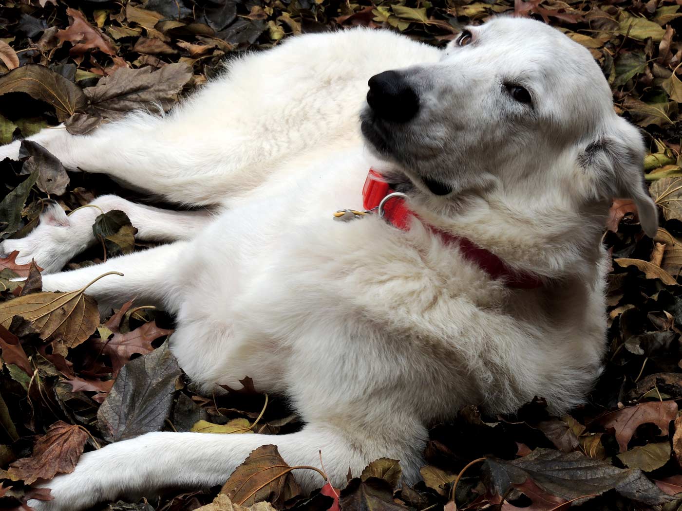 After all the ice and cold weather my back patio is covered in leaves. I guess Grace thinks it makes a decent bed. I let her out back for a while and after she realized we weren't going anywhere she decided to take a break. I had to get some treats to get her to come back in.