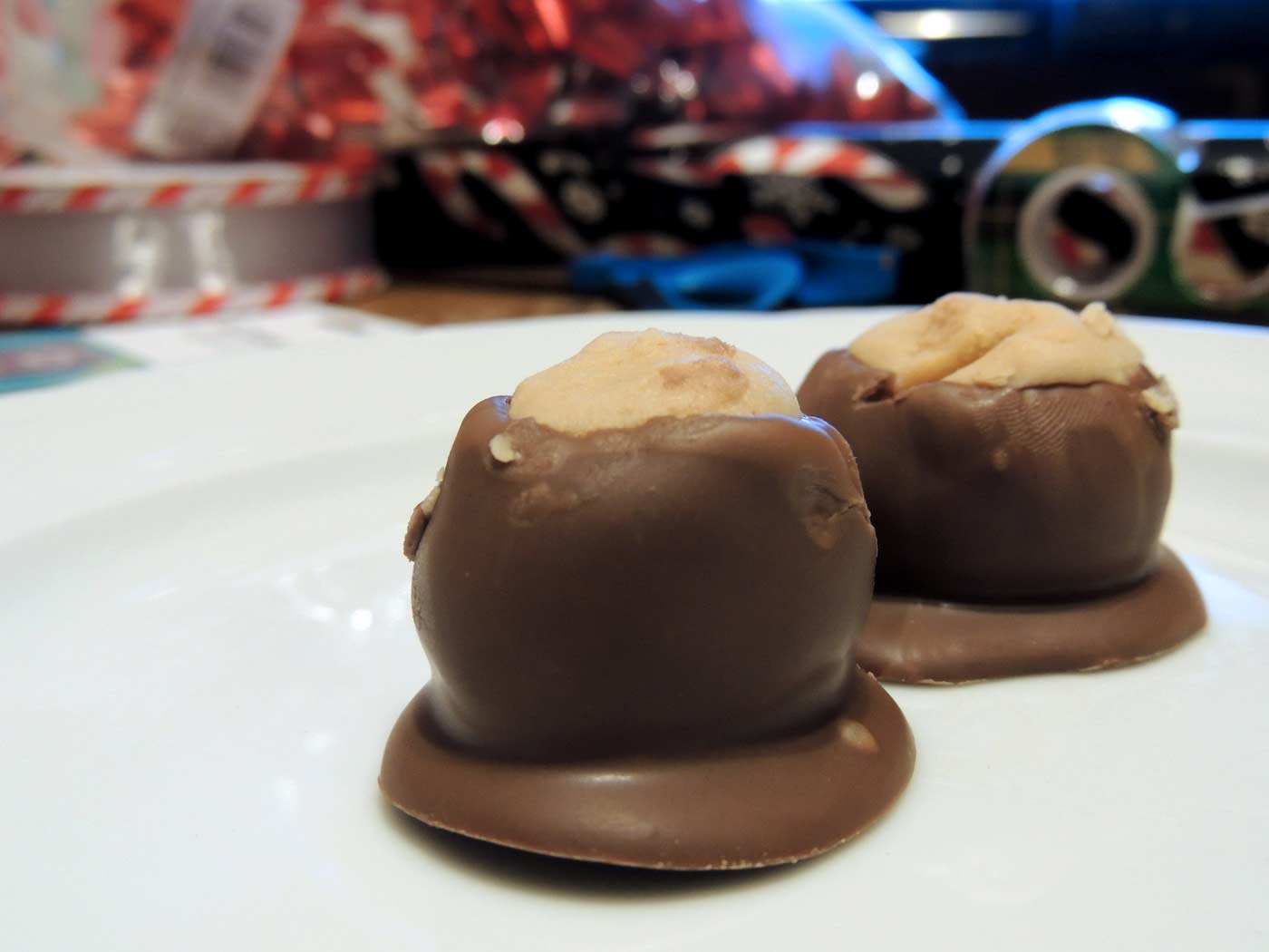 I spent the day at a friend's house helping her paint a room and some cabinets. I got home a little late and did some present wrapping. To keep my energy up I had some snacks that a friend gave me for Christmas. These are a little beat up. They were at the bottom of the tin.