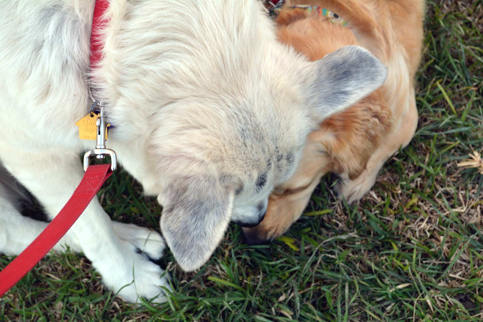 This goldern girl is Lola. She lives down the street and they both start whining when they see each other. The jump on each other and lick each other's face. It's funny to see Grace get so excited and playful. She's always so calm at home.