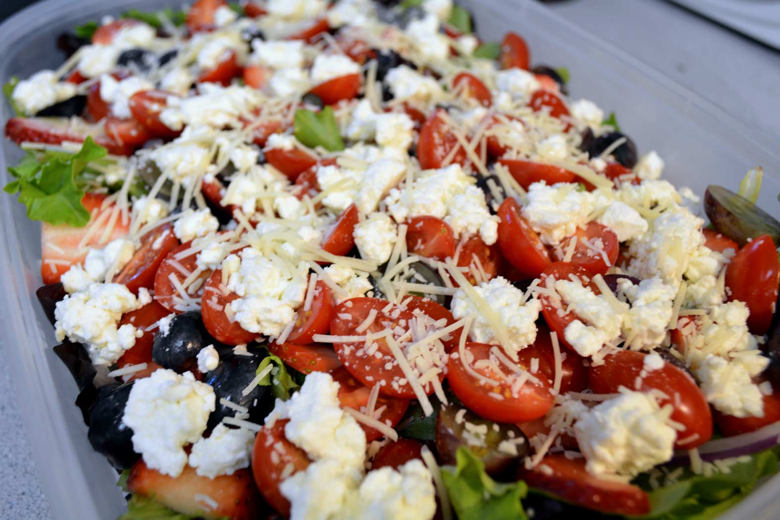 I was on my feet a lot today. I started by taking Grace for a walk and then putting some weed and feed on the yard. I did some vacuuming and laundry. I cleaned the kitchen and then made this salad with grapes and strawberries and the Greek Chicken Pasta. I have lunch and dinner for the week.