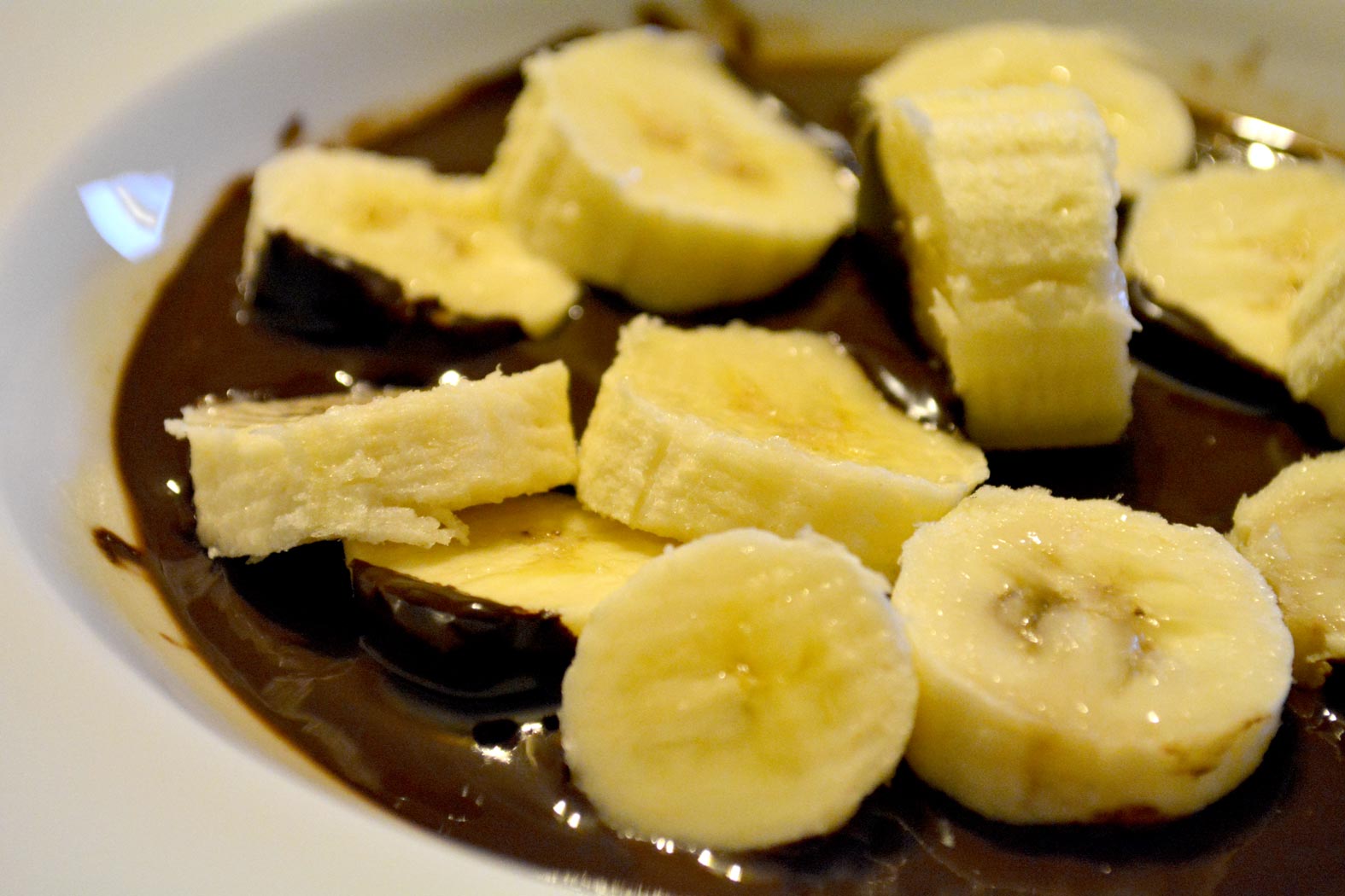 Not wanting to stop on my way home, I bought chocolate chips before dinner. They were in the car all during dinner. When I got home they were kinda soft and stuck together. If you microwave them with a little bit of coconut oil they get smooth and creamy. Perfect for cold bananas.