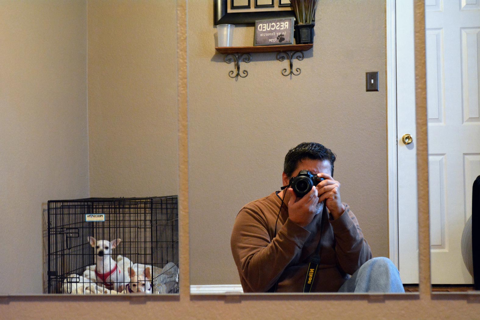 Today I went over to a friend's to hang some mirrors for her. A mutual friend came over and they went to get dinner while I finished up. I will indeed work for food and good company. They were afraid the chihuahuas would try to eat me while they were out so they put them in the kennels. Since I hung some mirrors I thought I'd take a selfie.