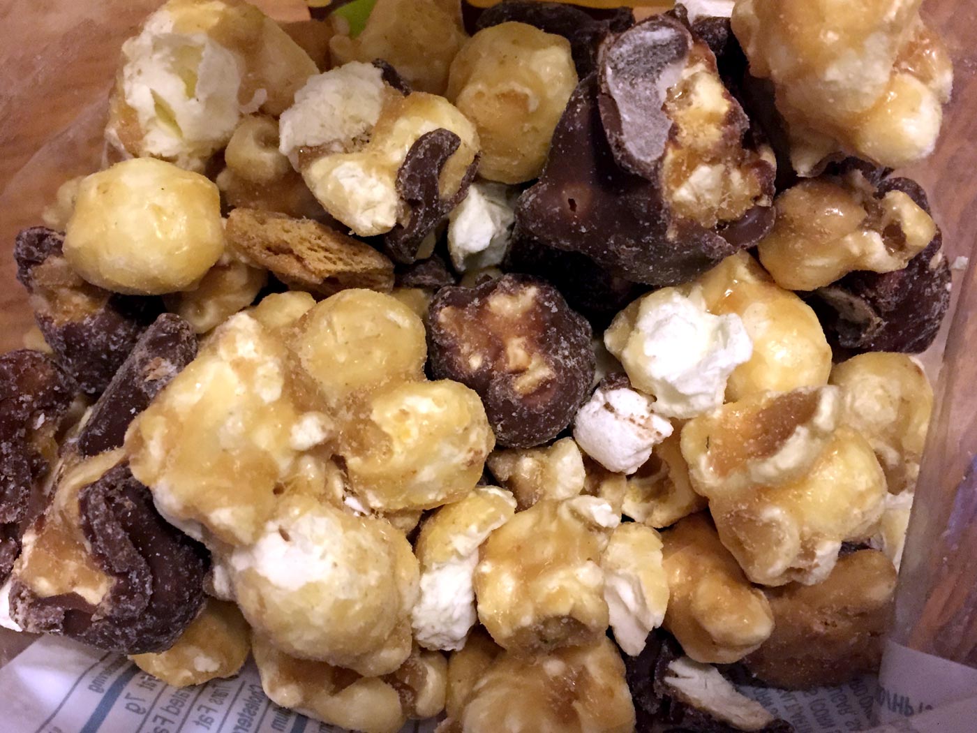 A vendor sent us a big tin at Christmas full of this stuff called Moose Munch. I'm not a big fan of popcorn in general, but I do like Kettle Corn. That aside the tin was way too big and we gave a lot of it away, it was individually packaged. I brought a pack home because the dark chocolate covered ones were really, really good.