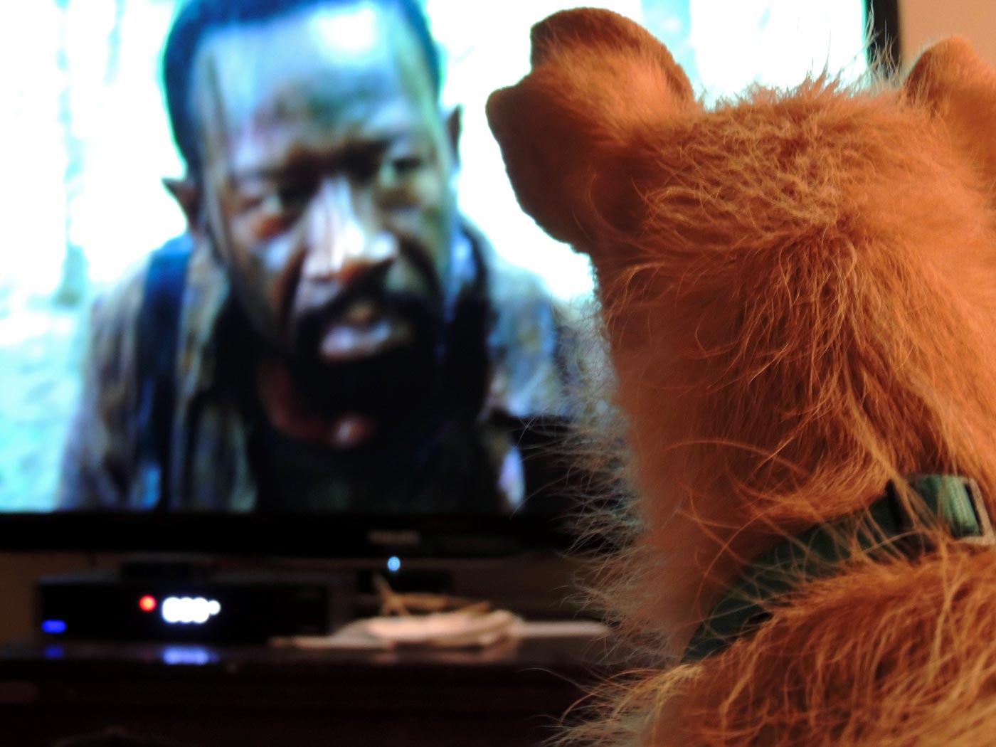 I feel like a bad parent. Pancake gets completely absorbed in TV shows. I think its the music that gets her. She starts to tremble if it's too scary. I feel like I'm letting a 4 year old watch The Walking Dead. She stood on the edge of the couch the whole hour and a half. If it's got horses or dogs in it she runs up to the TV and stands on two legs watching.