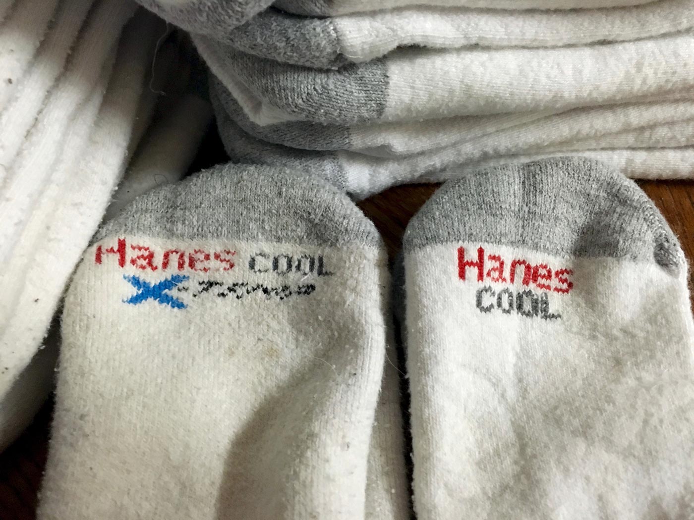 August 8, 2016 - Monday - The sock on the left I've had for a long while. The sock on the right I bought last week. I like the socks enough to buy some more and these are essentially identical except for this stitching on the bottom. However, I can't bring myself to not pair them correctly or wear them if they don't match even though no one will ever know.