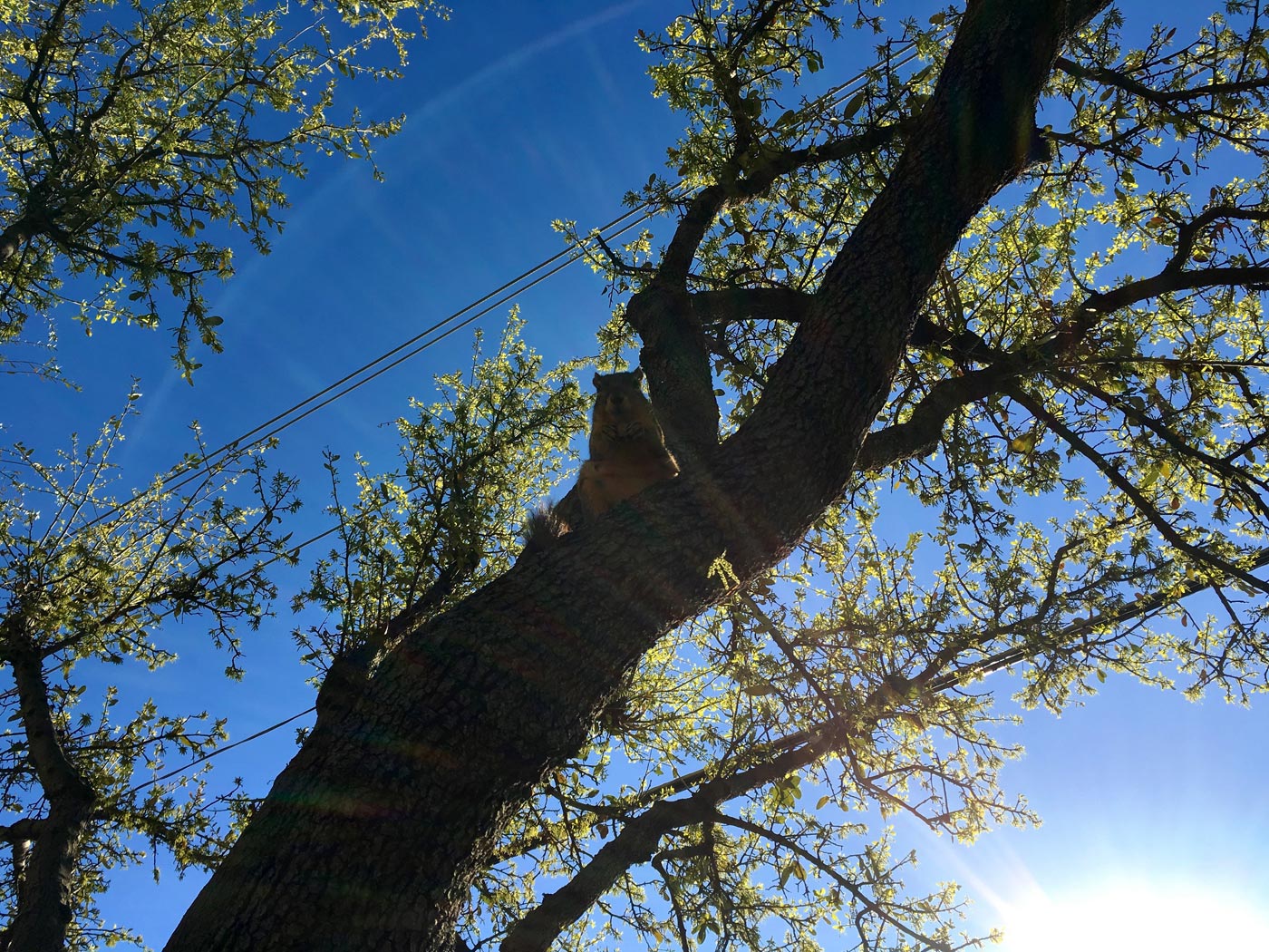 March 21, 2016 - Monday - After work I come home and take the puppies for a quick walk to a little grassy area so they can potty. Pancake goes bonkers when she sees a squirrel up close. This one ran across the grass and up on the fence for a little while just to mock her I think. Then she went up into this tree. I was able to take this in spite of Pancake.