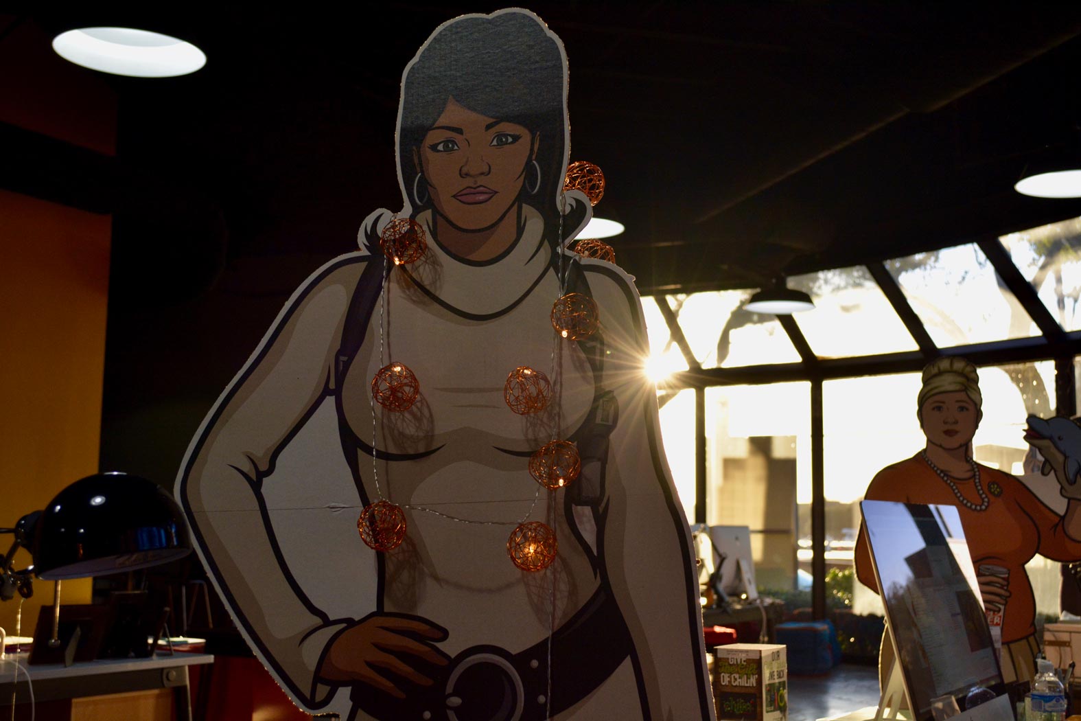 January 31, 2017 - Tuesday - At this time of the year the sun comes in at the end of the day and shines right in our faces. We use our Archer standees as sunblock. Lana still has her beads on from Halloween.