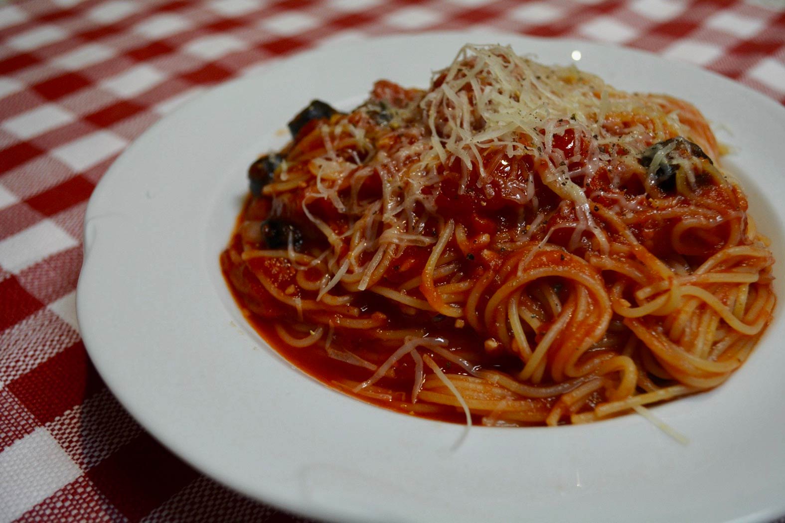 April 26, 2017 - Wednesday - Going through all the photos last week of our food from our trip to Rome got me inspired. I looked at several recipes for Spaghetti Arrabiata and then did a version of my own. Lots of garlic, some black olives, fresh grape tomatoes and some fresh oregano from a friend's garden. Oh and some cayenne pepper for the heat.