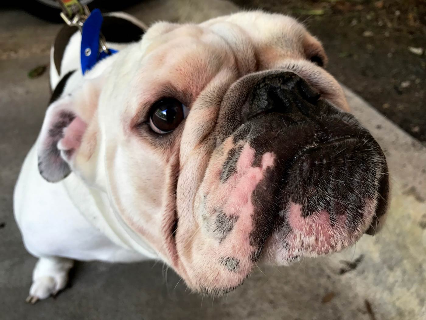 April 19, 2017 - Wednesday - I didn't sleep well last and was running late to work this morning. I completely forgot I had dinner plans after work today so I came home for lunch and to change. I ran into a lady outside walking this guy. He has lots of white hair on his face too. Grace was at the patio door barking at me petting him.