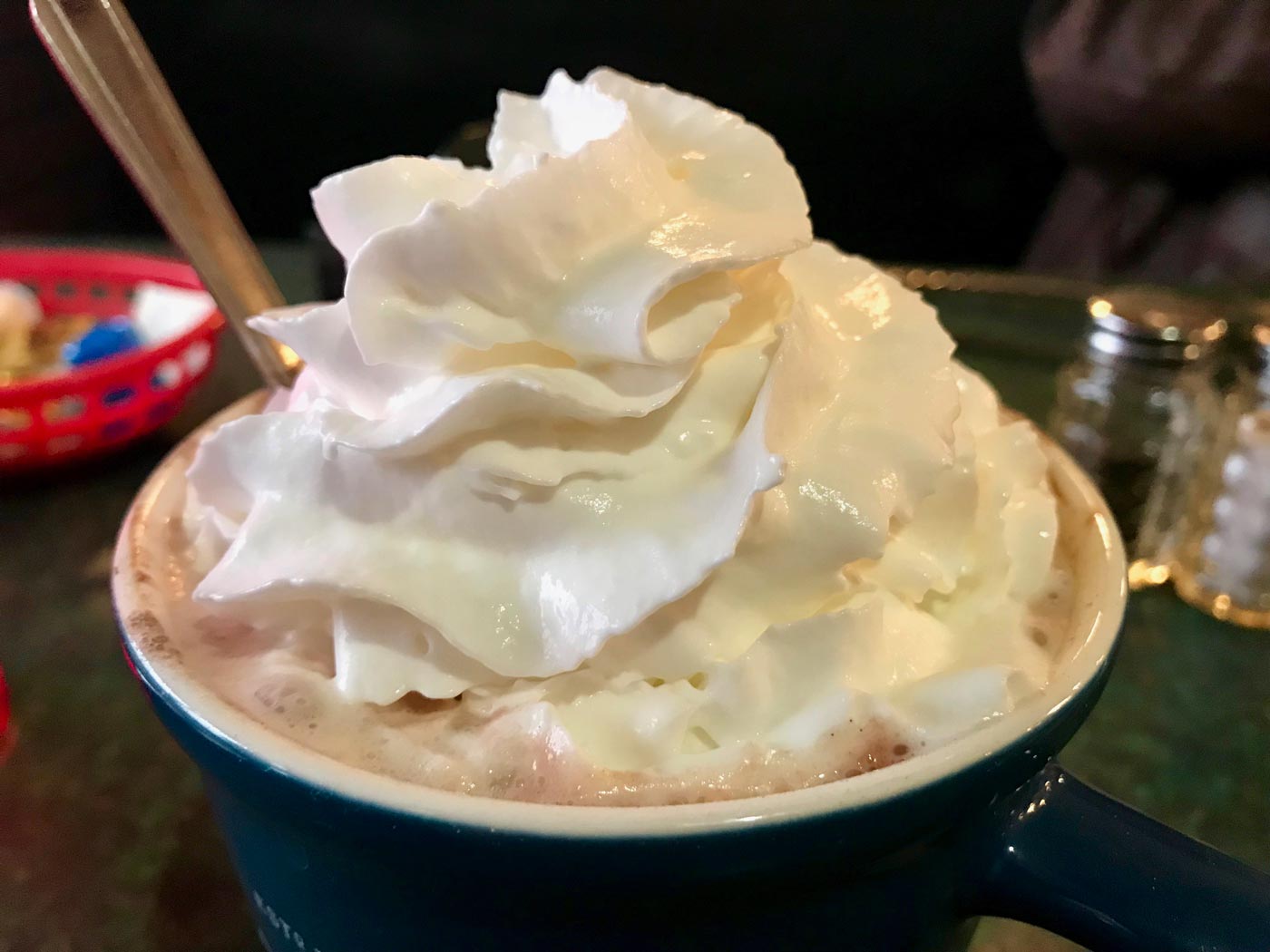 December 24, 2017 - Sunday - Woke up with a pretty good flare up going. Still went out to breakfast with my dad and my cousin at a diner they like a lot. The food is good there but this big cup of hot cocoa was really worth getting out in the cold for.