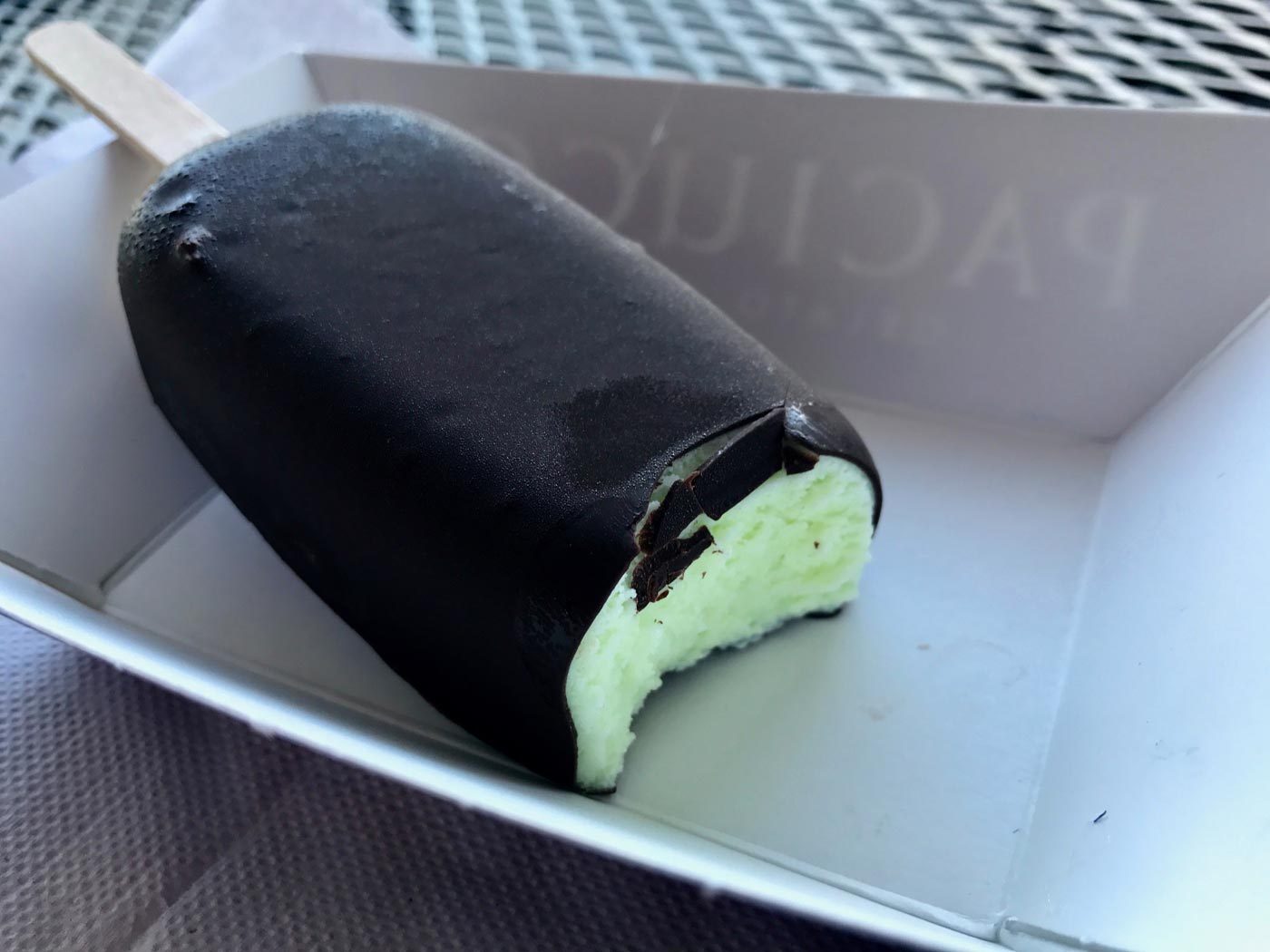 July 12, 2017 - Wednesday - Went out to dinner with a friend. Dinner was good but they have these new ice cream bars at Paciugo. Not that they taste much different than their gelato in a cup, but this mint with chocolate shell is even better than the mint chocolate chip. It was even good enough to eat outside.