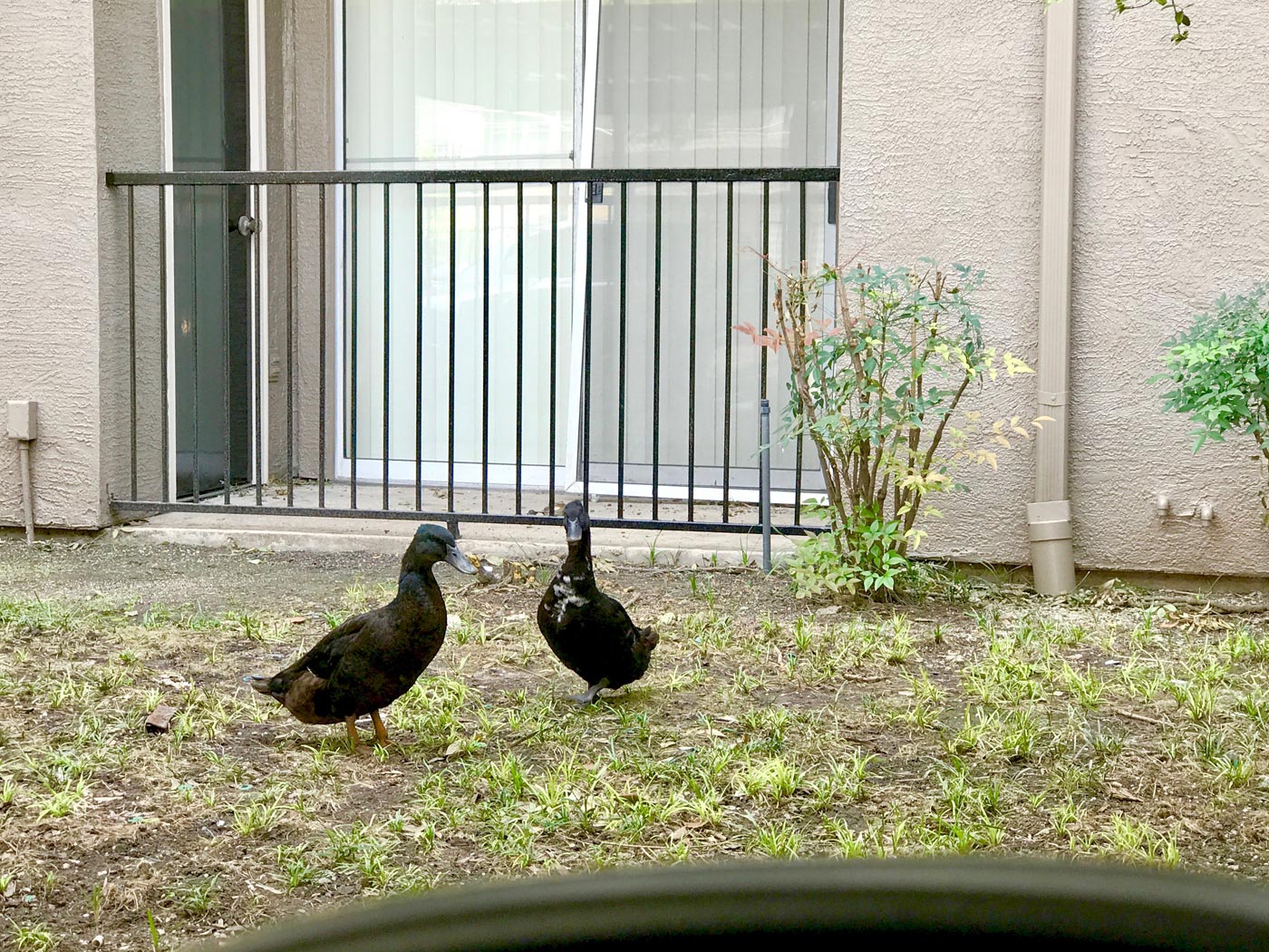 September 12, 2017 - Tuesday - The last few days these two ducks have decided the area outside my patio is a good place to have a conversation very early in the morning. They're very talkative just as the sun is coming up. I have no idea why they've picked this little grassy area. You'd think over by the pool would be more to their liking.