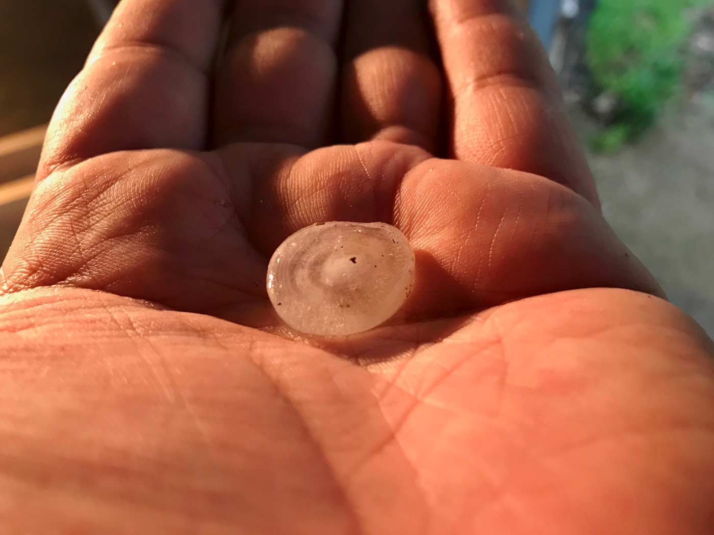 April 13, 2018 - Friday - I guess this Friday the 13th probably was pretty unfortunate for some who got this worse than we did. It rained really hard and we got a little bit of pea-sized hail. This one landed just outside the garage and I was able to pick it up without being hit by anything other than the rain.