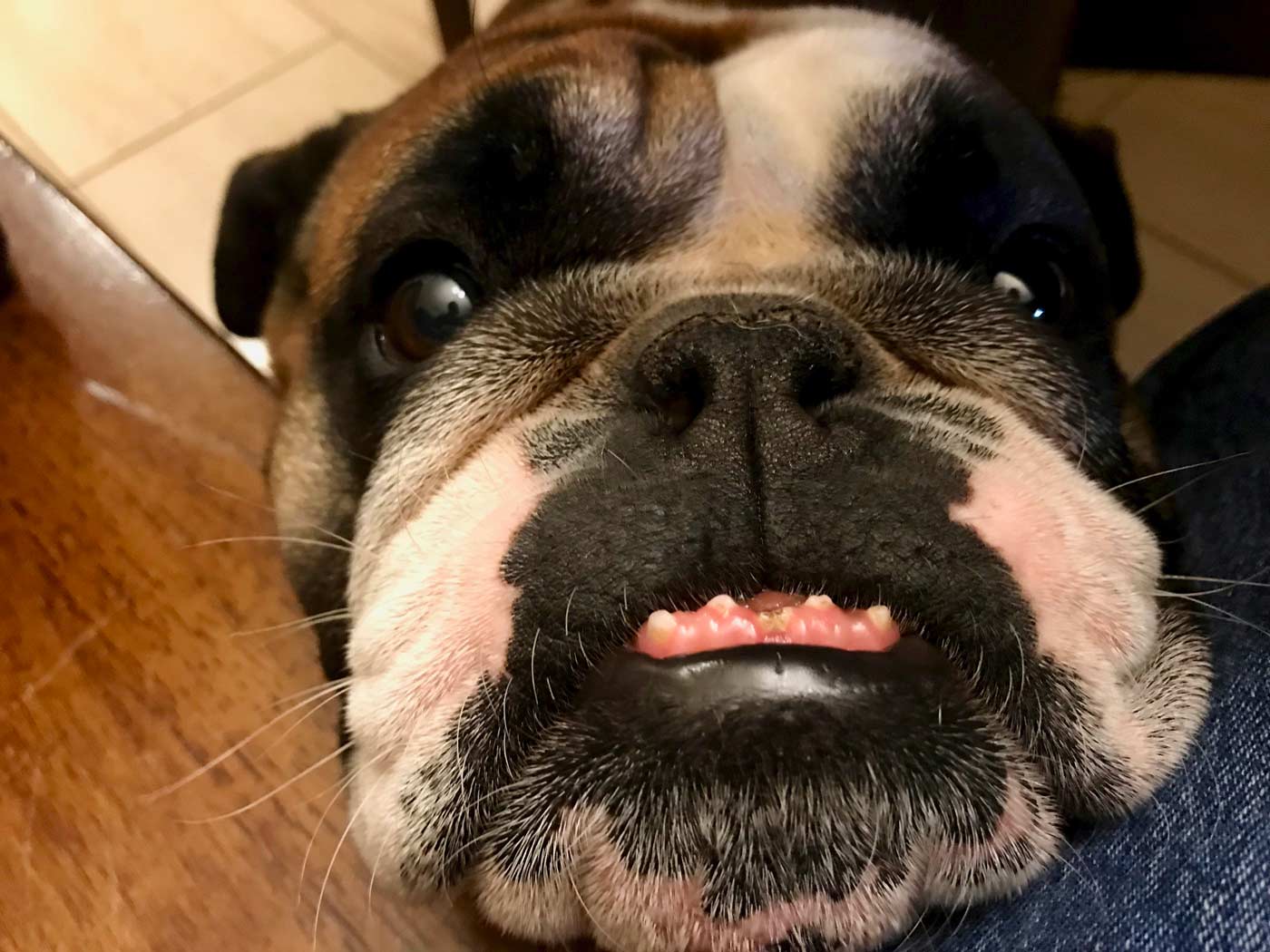 April 29, 2018 - Sunday - This is my brother's other dog, Dozer. He looks kinda high all the time. He doesn't hold still very much to take a photo so its even funnier that this is the one photo I got of him that wasn't blurry. I call him Killer too since he barks even more than Rusty. That aside he's become a lot more friendly since I moved here.