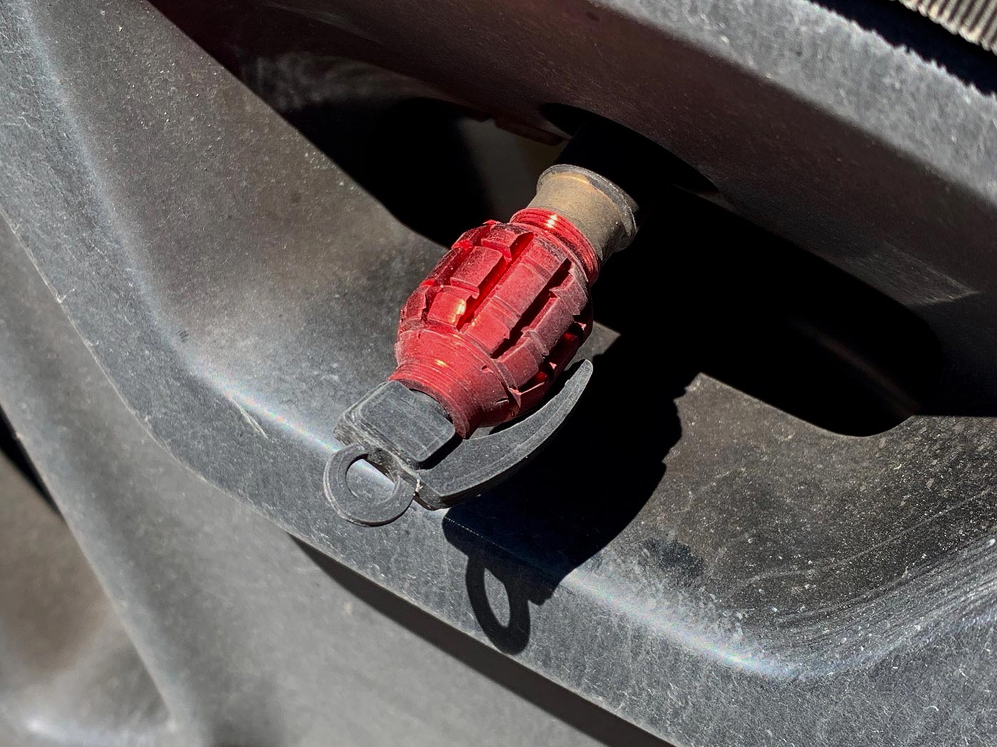 March 5, 2019 - Tuesday - I was going to meet a friend for lunch and while getting into my car I noticed these on the Jeep parked next to me. When I sat down in my car I also noticed the antennae was replace by a large caliber bullet casing. I wondered about the reception of such a small antennae.