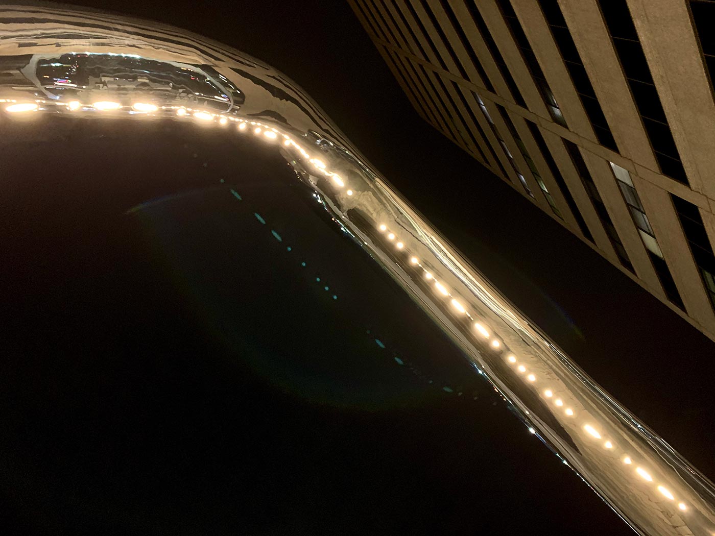 November 6, 2019 - Wednesday - Our office has recently been renovated inside and out. They put this arch out front as some form of art. A friend and I joked that it's like the Chicago bean that shriveled up and melted in the Texas heat. It is kinda cool that it lights up the front of the building too.
