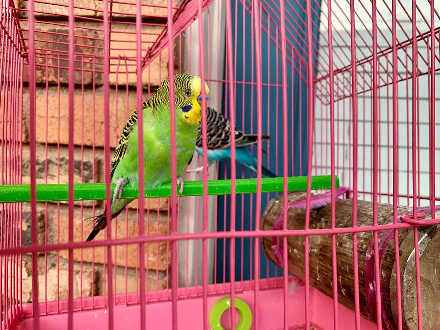 November 8, 2019 - Friday - We have a neighbor who puts out their pet birds when the weather's nice. It's nice to walk out and hear them singing and chirping. Biscuit and Pancake were not the least bit interested in these two.